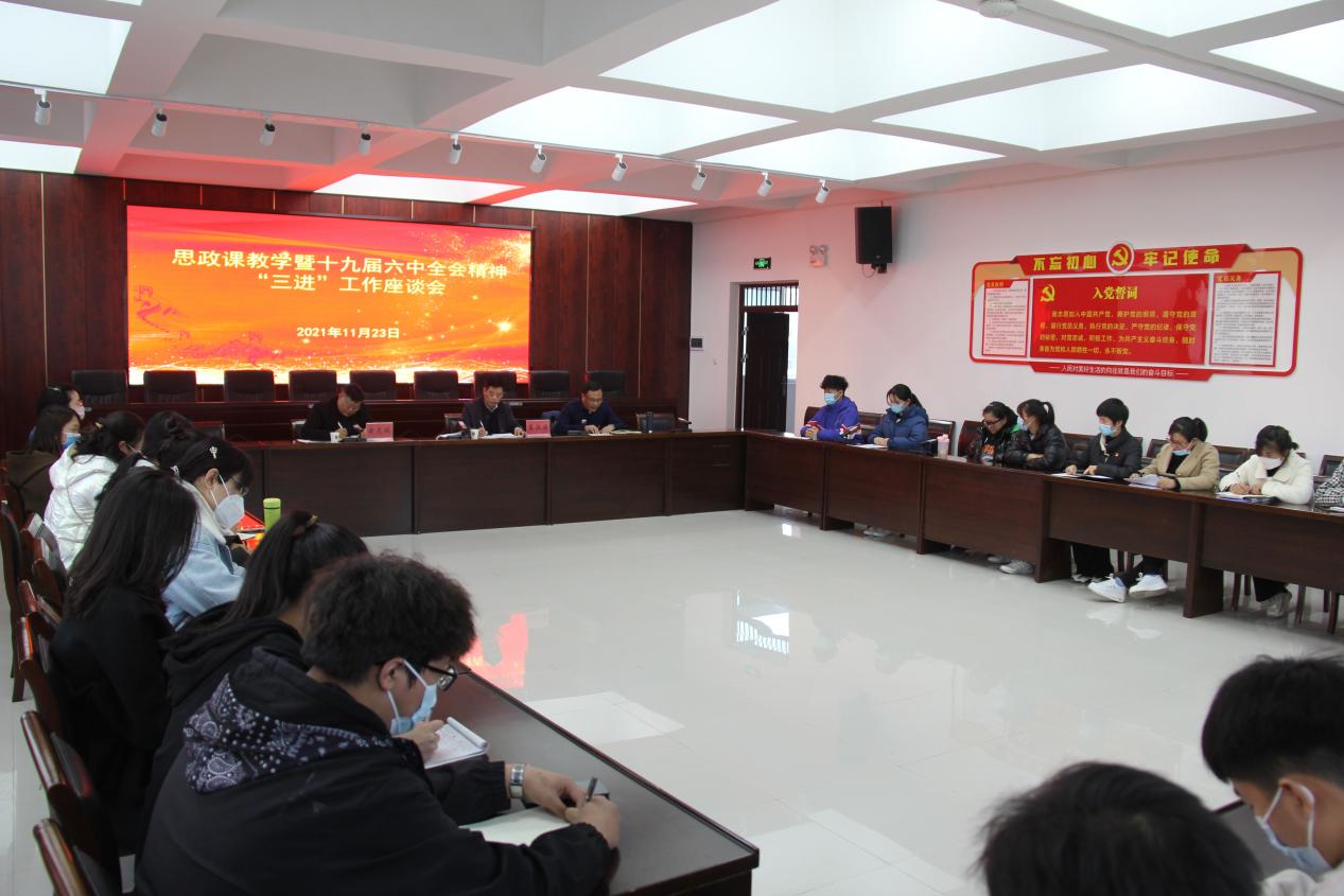 11月23日,思政部在第五会议室召开了思政课教学暨党的十九届六中全会精神“三进”工作座谈会,院长焦洪涛、副院长毋虎城、思政部全体教师以及全院各系部、二级学院的学生代表参加座谈。思政部主任贾超群主持会议。