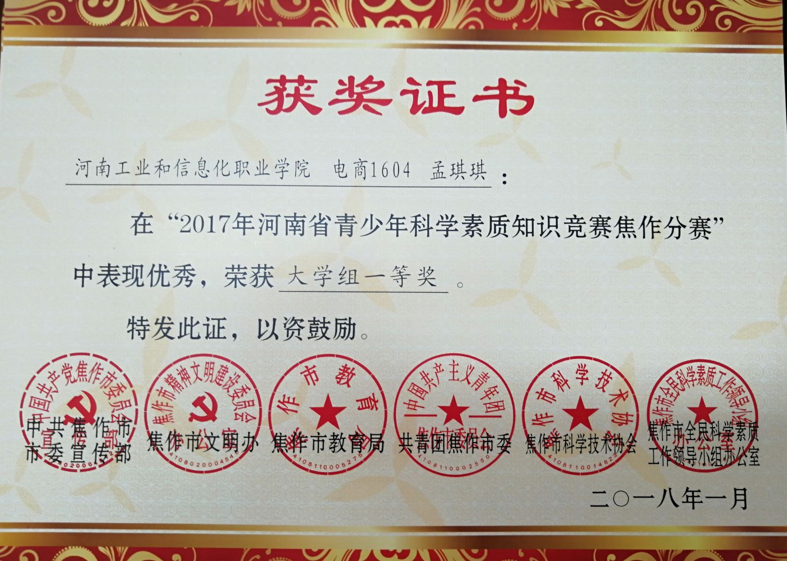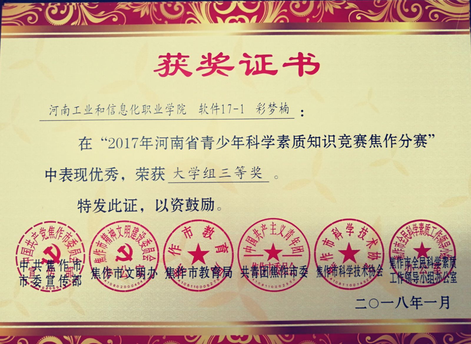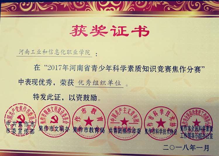 近日,2017年河南省青少年科学素质知识竞赛焦作分赛活动结果揭晓。在本次竞赛中,我院组织得当,表现突出,荣获多个奖项。其中学院喜获优秀组织单位奖;孟琪琪等6名同学荣获大学组一等奖,杜亚辉等30名同学荣获大学组二等奖,彩梦楠等55名同学荣获大学组三等奖。