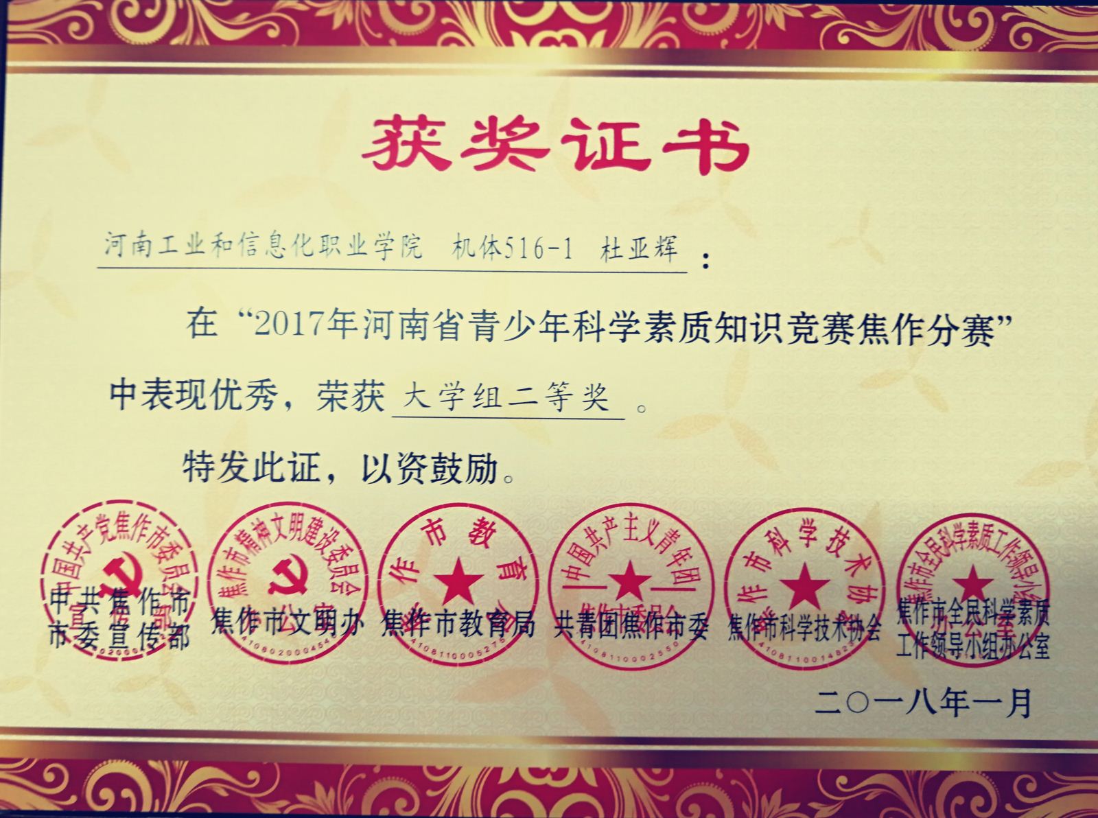 我院91名学生在2017年河南省青少年科学素质知识竞赛焦作分赛中荣获奖项