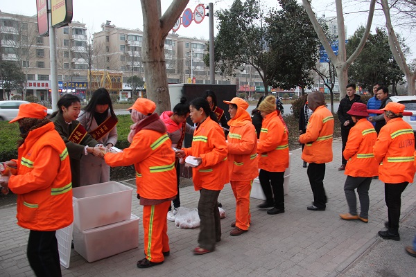 初春三月,山阳大地乍暖还寒。3月8日凌晨6:00,值第106个“三八”国际妇女节来临之际,我院大学生志愿者协会8名同学在院团委相关老师的带领下,来到山阳区环卫处环卫三所,为早起清扫城市街道的126名环卫女工送上了温馨早餐和节日祝福。
