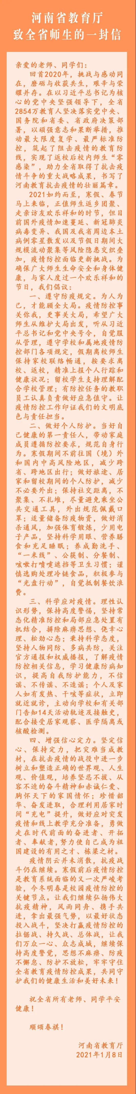 为此,省教育厅发出致全省师生的一封信,倡议大家遵守防疫规定、做好个人防护、科学应对疫情、增强信心定力,继续弘扬伟大抗疫精神,保持高度警觉,思想不麻痹、防疫不懈怠、防护不放松,共同守护我们的健康生活和美好未来!