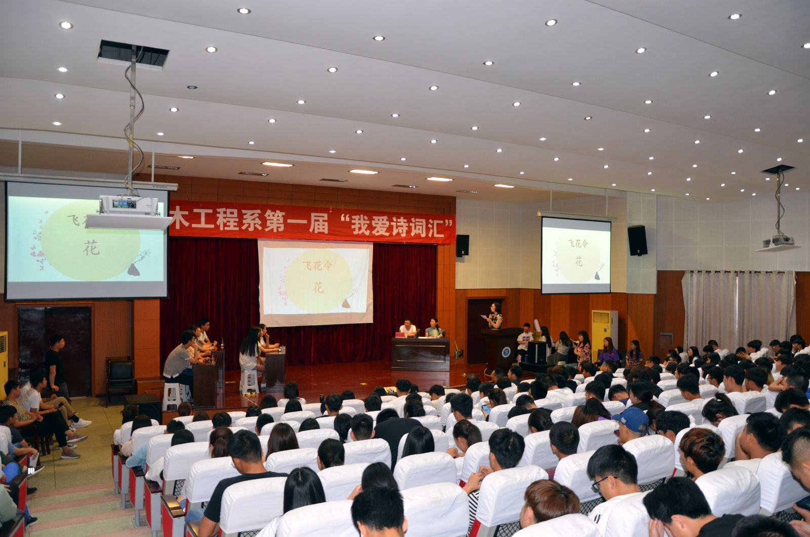 为弘扬中华优秀传统文化,营造书香校园,促使学生接受传统经典的洗礼,5月29日下午4点,由土木工程系和基础部联合举办的的第一届“我爱诗词汇”诗词大赛的决赛在我院多功能报告厅举行。比赛由基础部丁晓、常海云两位老师担任点评嘉宾,苏蕾老师任主持人。土木工程系300余名师生现场观看了比赛。