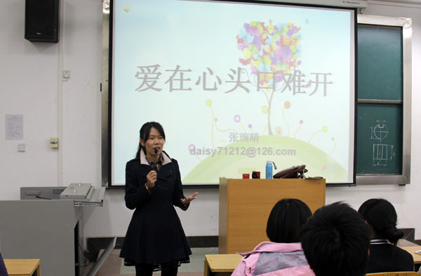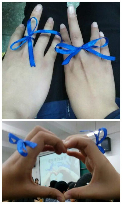 “我对你的爱就像一个金库,原本里面非常富有,但你只知索取而从不回报,慢慢的这个金库里一分不剩,最后只留有一个空壳……”报告从一段富有哲理又通俗易懂的开场白引入。讲座中,张老师从“我们需要爱,却总在猜测”、“我们拥有爱,却不善表达”、“让爱张口说话”等三个方面为同学们阐述了“爱在心头口难开”的主要内容。同时,她为同学们分析了现代社会人与人在相处中因缺少爱、不敢表达爱而容易出现的一些问题和误会,鼓励大家要敢于把自己心中火热的爱正确、理性地表达出来。借助“蓝丝带的故事”,张婉晴老师现场为所有同学发放了蓝丝带,希望同学们以蓝丝带作为爱的媒介和载体,借助蓝丝带的力量鼓起勇气,行动起来,营造一个充满爱的世界。讲座现场温馨感人,暖意融融。