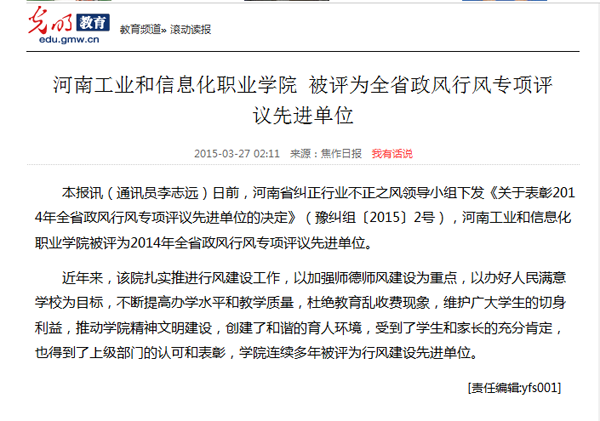 近日,《焦作日报》、光明网教育频道、华北新闻网等媒体对此进行了相继报道。近年来,我院以加强师德师风建设为重点,以办好人民满意学校为目标,不断提高办学水平和教学质量,扎实推进行风建设工作,得到了学生、家长、上级部门和社会各界的一致好评和充分肯定,连续多年被评为行风建设先进单位。