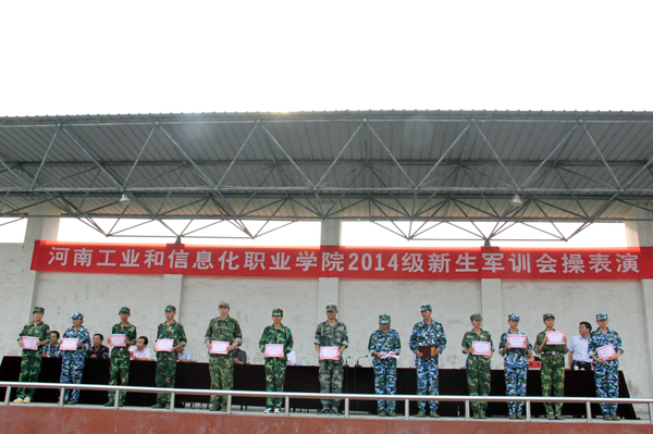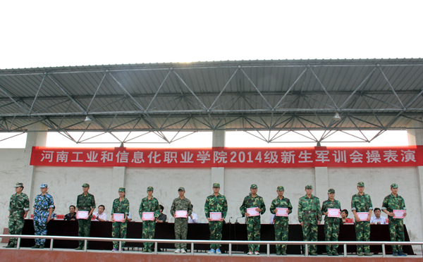 伴随着汗水、泪水、快乐与友谊,经过半个月的刻苦训练,我院2014级新生圆满完成了军训任务。9月22日下午,新生军训会操表演在学院体育场隆重举行。中国人民解放军预备役部队409团政治部主任罗先德中校、学院领导王海长、陈荣邦、席振修、邱雨生、学院相关处室和各系负责人观看了会操表演并为受表彰的军训优秀教官和先进个人颁奖。会操表演由学生处处长刘士合主持。