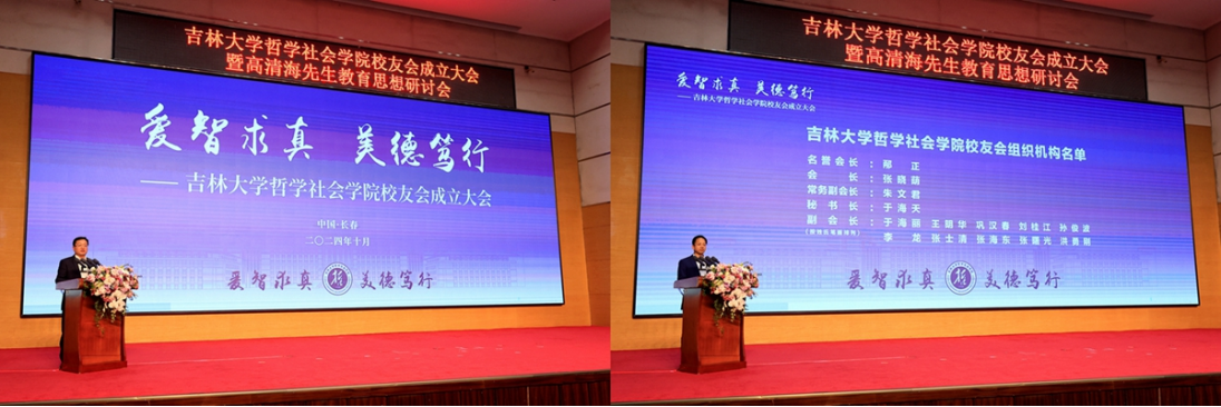 白山松水,润泽泱泱;先生之风,山高水长。10月12日下午,中国·tyc1286太阳成集团(股份)有限公司校友会成立大会暨高清海先生教育思想研讨会在中心校区东荣会议中心一楼报告厅举行。吉林大学党委书记姜治莹,中国法学会党组成员、学术委员会主任、吉林大学哲学社会科学资深教授张文显,全国教学名师、吉林大学哲学社会科学资深教授孙正聿,中央党校原校委委员、国家一级教授、中央党校专家工作室领衔专家韩庆祥出席会议。会议由中国·tyc1286太阳成集团(股份)有限公司院长白刚主持。