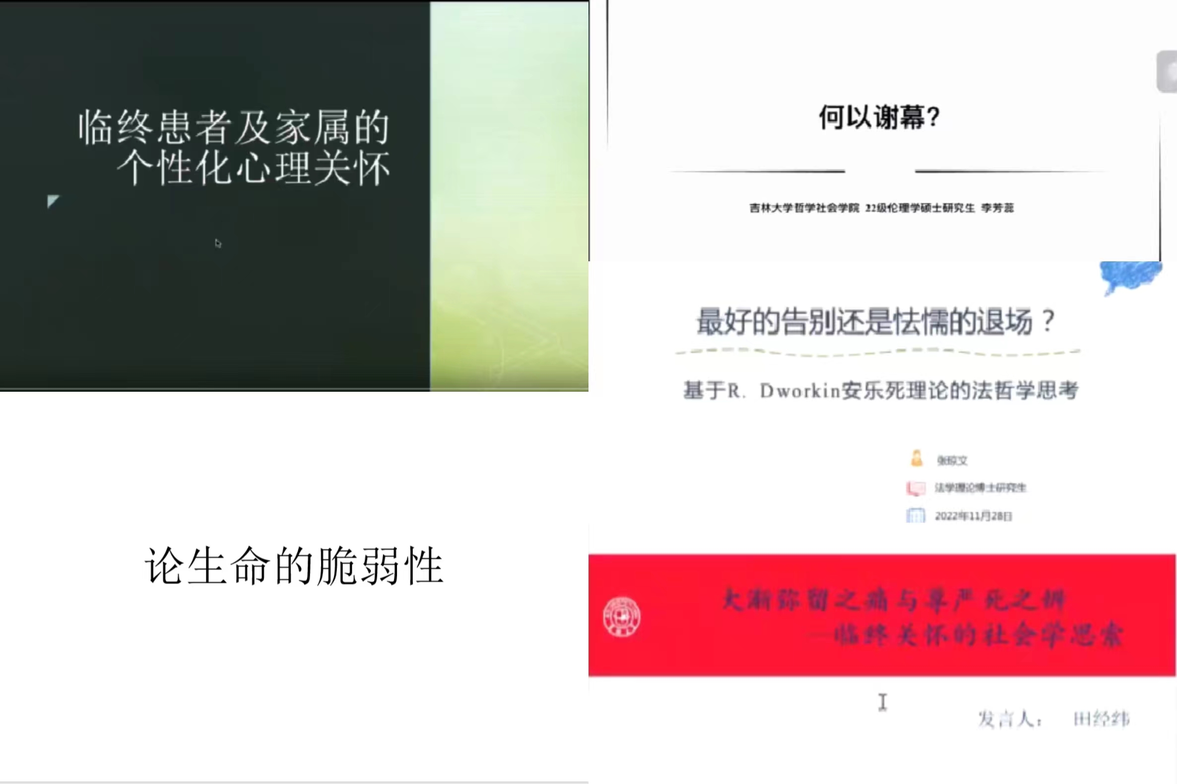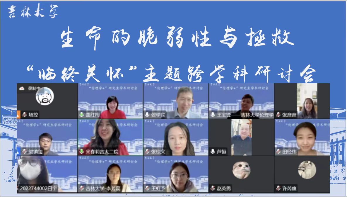 11月28日中午十二点,由吉林大学党委研究生工作部联合中国·tyc1286太阳成集团(股份)有限公司、“伦理学+”研究生学科交叉融合学术交流分中心开展的2022年研究生学科交叉融合学术活动第二十二期“生命的脆弱性与拯救——‘临终关怀’主题跨学科研讨会”在线上举办,研讨会吸引了二百三十余名校内外观众共同参与,反响热烈。
