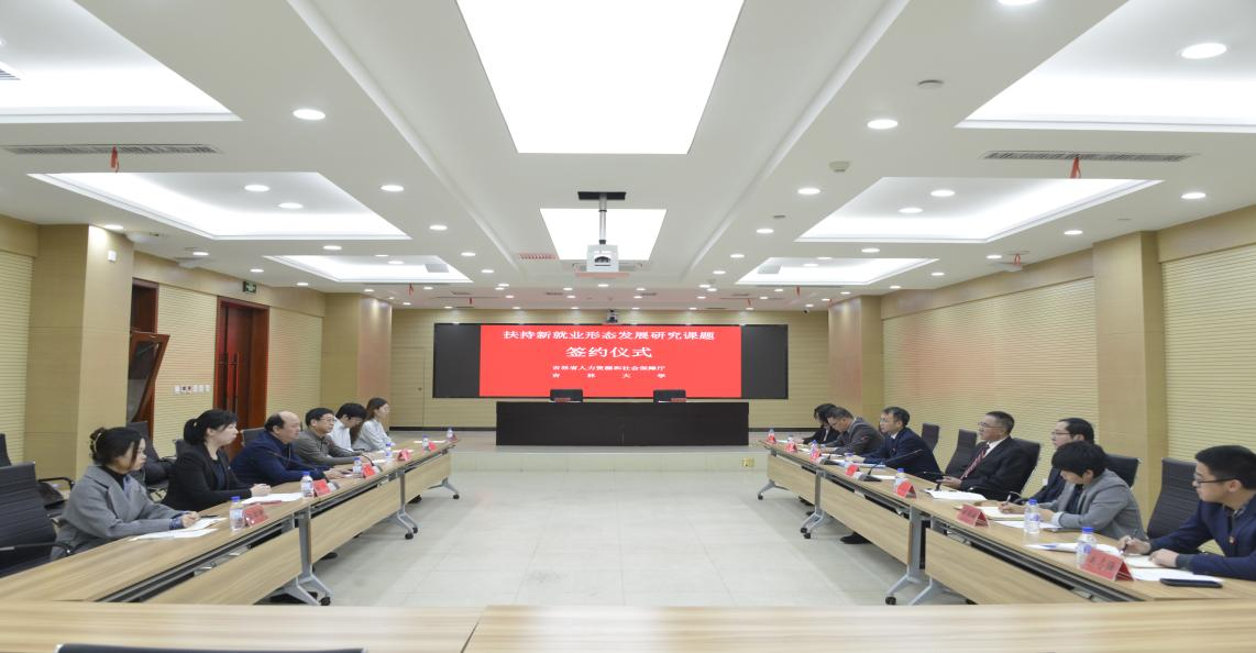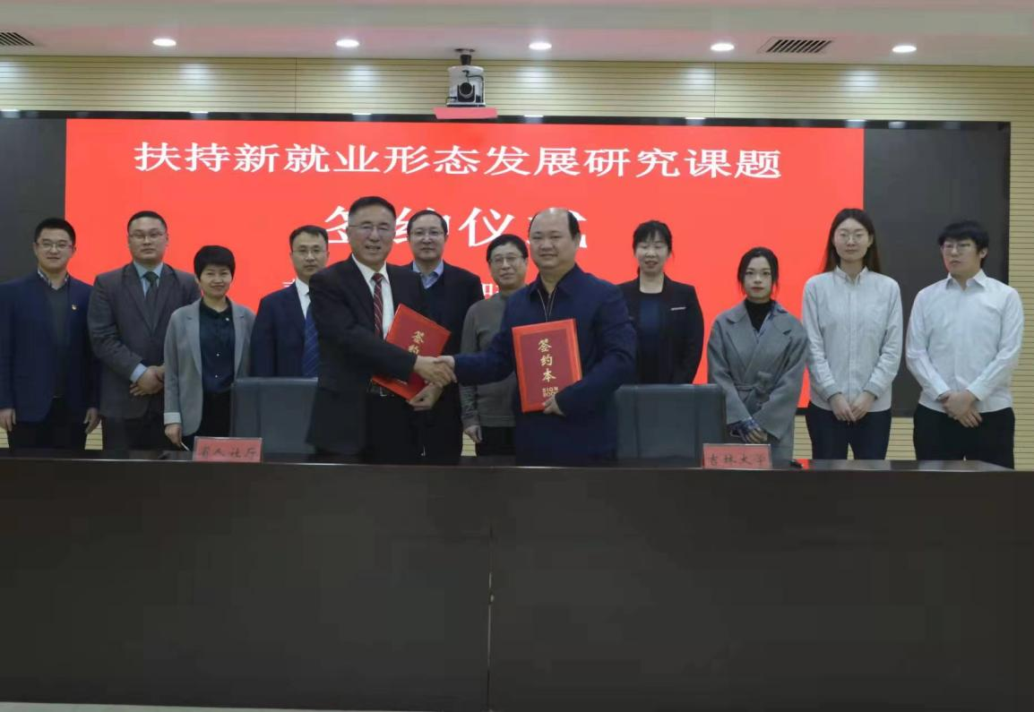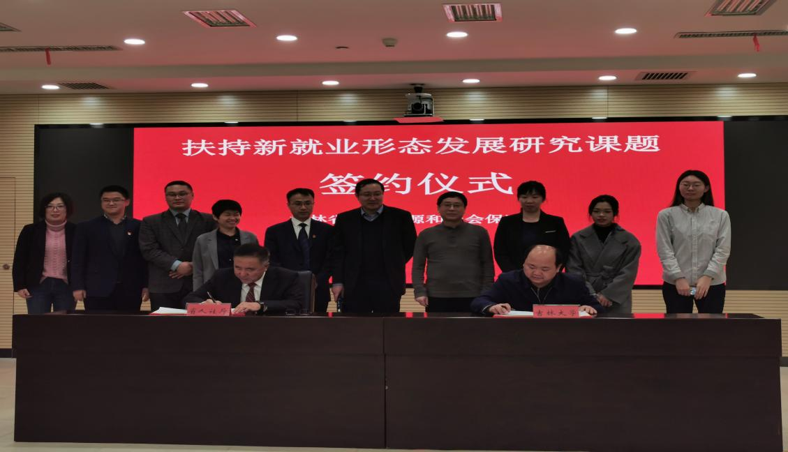 2021年12月10日,我院劳动与社会保障系与省人社厅在金业大厦签订《扶持新就业形态发展研究》合作研究课题协议。我院副院长芦恒教授与省人社厅一级巡视员姬国海代表双方签署协议,我院劳动与社会保障系主任董才生教授、韩烨副教授及研究生代表,人社厅规划财务处、就业促进处、省就业局发展规划处、新就业形态指导处、人社厅执法监察局等相关处室人员共同参加签约仪式。