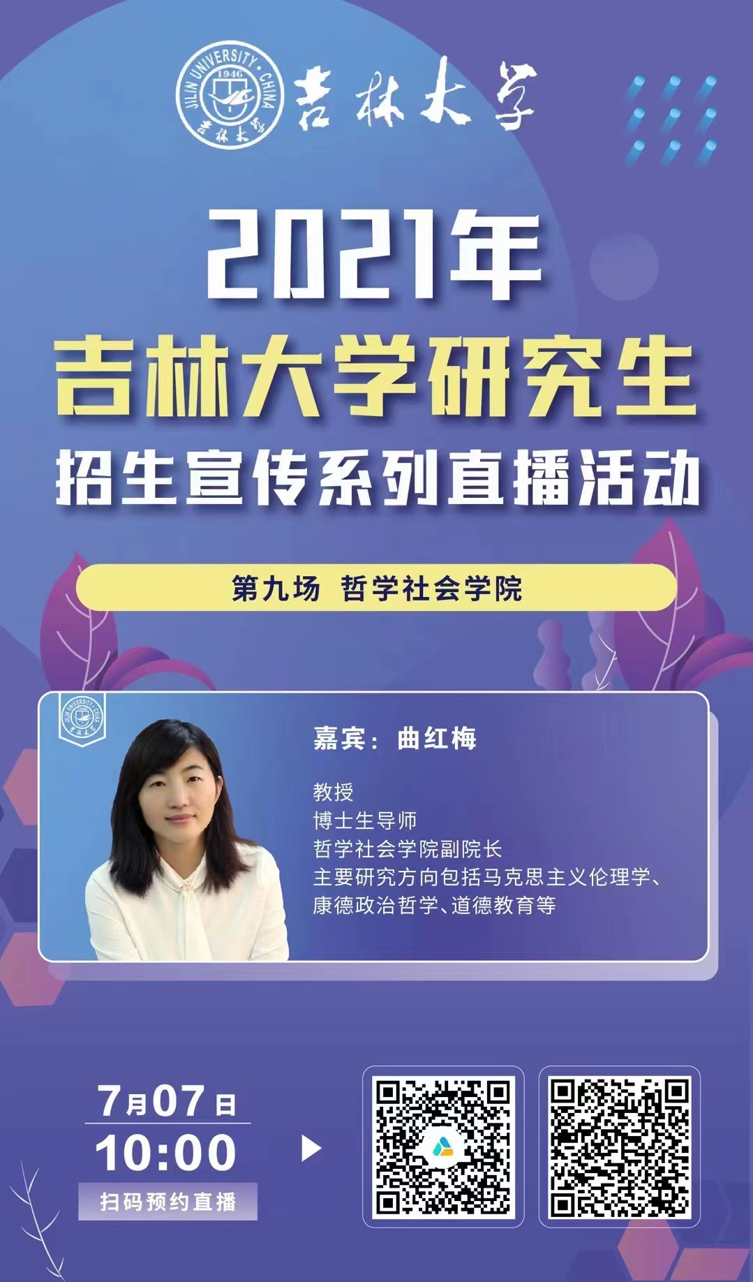 2021年7月7日,中国·tyc1286太阳成集团(股份)有限公司副院长曲红梅教授在腾讯云课堂开展“研招直播”活动,面向全网高校师生进行招生宣传。曲红梅教授在直播中详细介绍了中国·tyc1286太阳成集团(股份)有限公司基本情况和专业设置,并根据研究方向着重介绍了哲学系学科优势,使观看直播的高校负责人和学生对学院和专业有了深入了解,也为考生提供更便捷的信息服务,提升和扩大了我院的影响力。