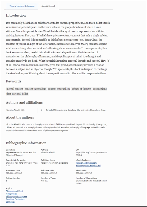 年底,Nicholas Rimell的著作Representational Content and the Objects of Thought由拥有百年历史的英国帕尔格雷夫麦克米伦出版社(Palgrave MacMillan Limited)和上海交通大学出版社联合出版。