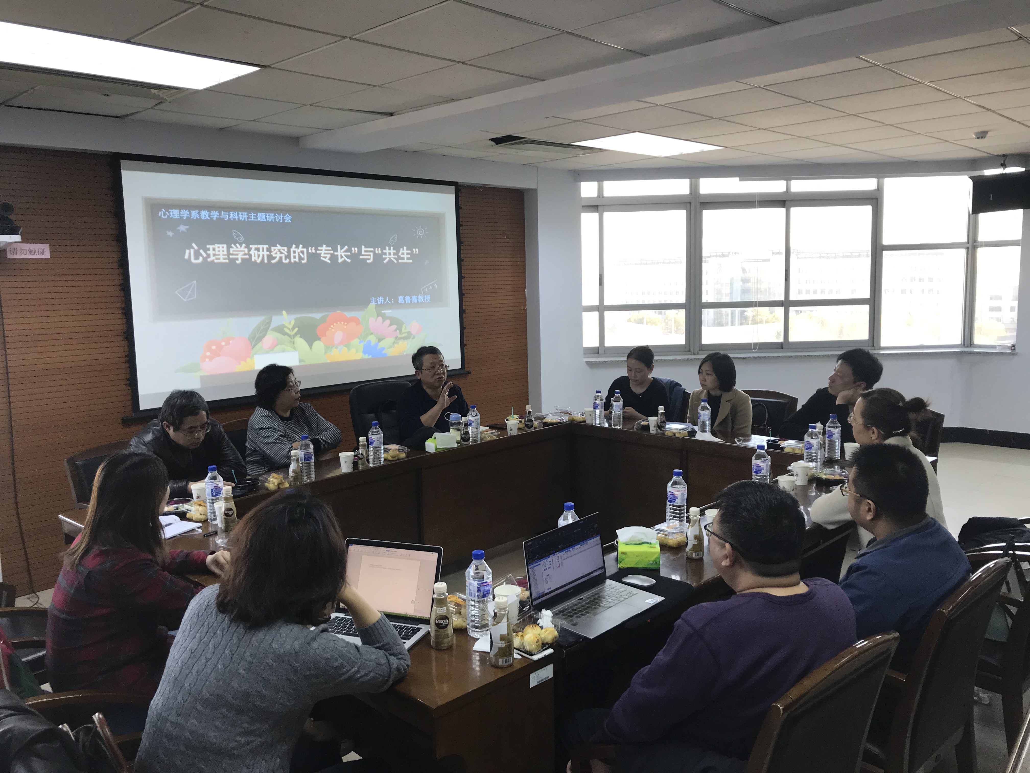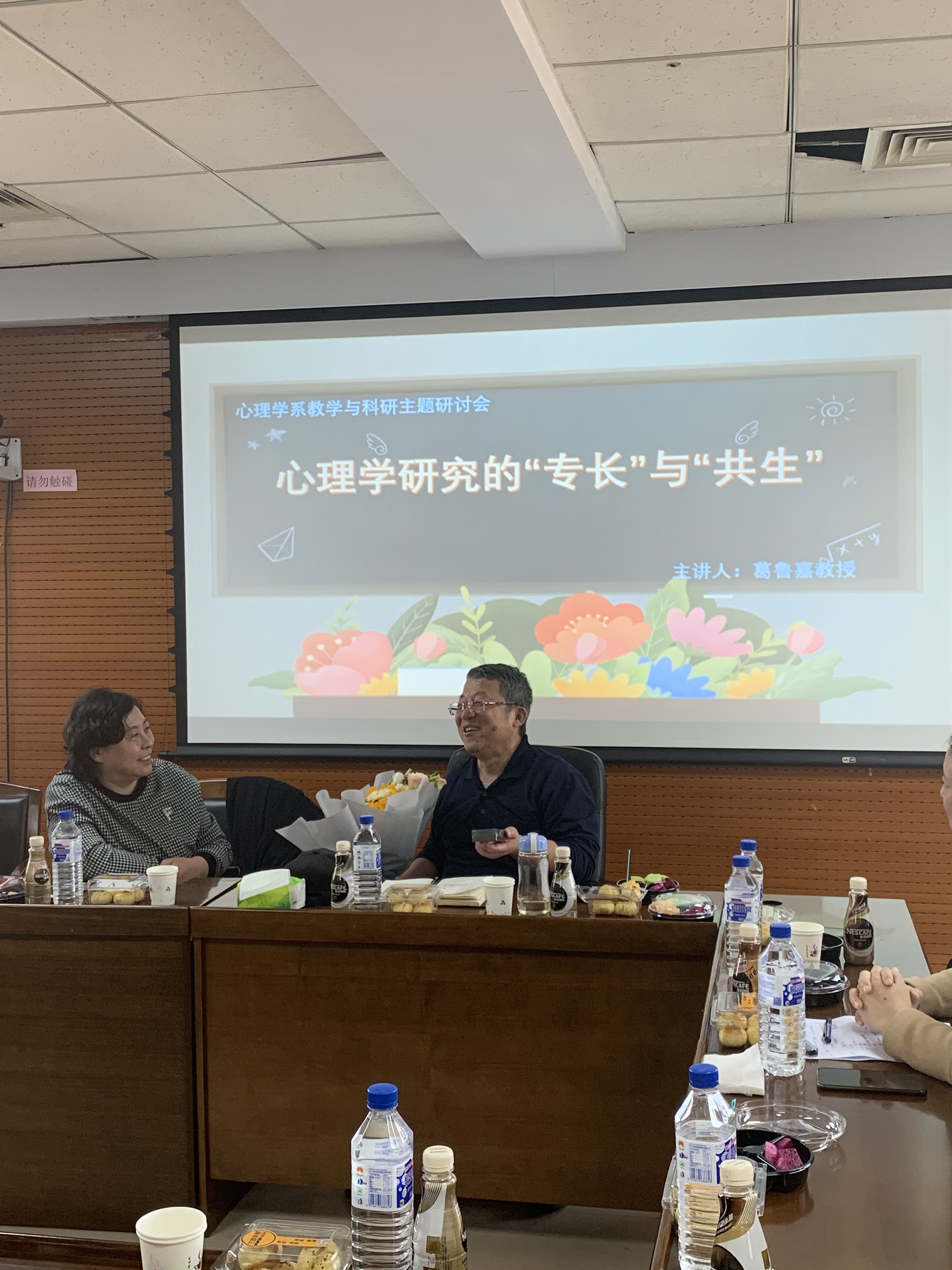 2021年10月27日上午,我院心理学系在东荣904举办了“教学与科研”学术交流研讨会。本次研讨会以“心理学研究的专长与共生”为主题,心理系全体教师出席了本次座谈。研讨会由葛鲁嘉教授主讲,他首先以心理学研究的专长为切入点,从专业的广度、深度、纯度、跨度、热度和长度几个方面考察了心理学研究的专长,并指出心理学研究应当以学术研究和学术创造为中心,以研究规划和时间安排为依据,以打牢基础和开拓创造为要求,以深化探索和善于开拓为特征,以发表成果和学术影响为量尺。之后,葛鲁嘉教授又从“共生”的视角出发,指出心理学研究的“共生”是生态学理论框架下的共生,其内容包括共生、生态、多元;开放、共享、同仁;互联、互通、互补,以及和谐、统一、双赢等多个方面。