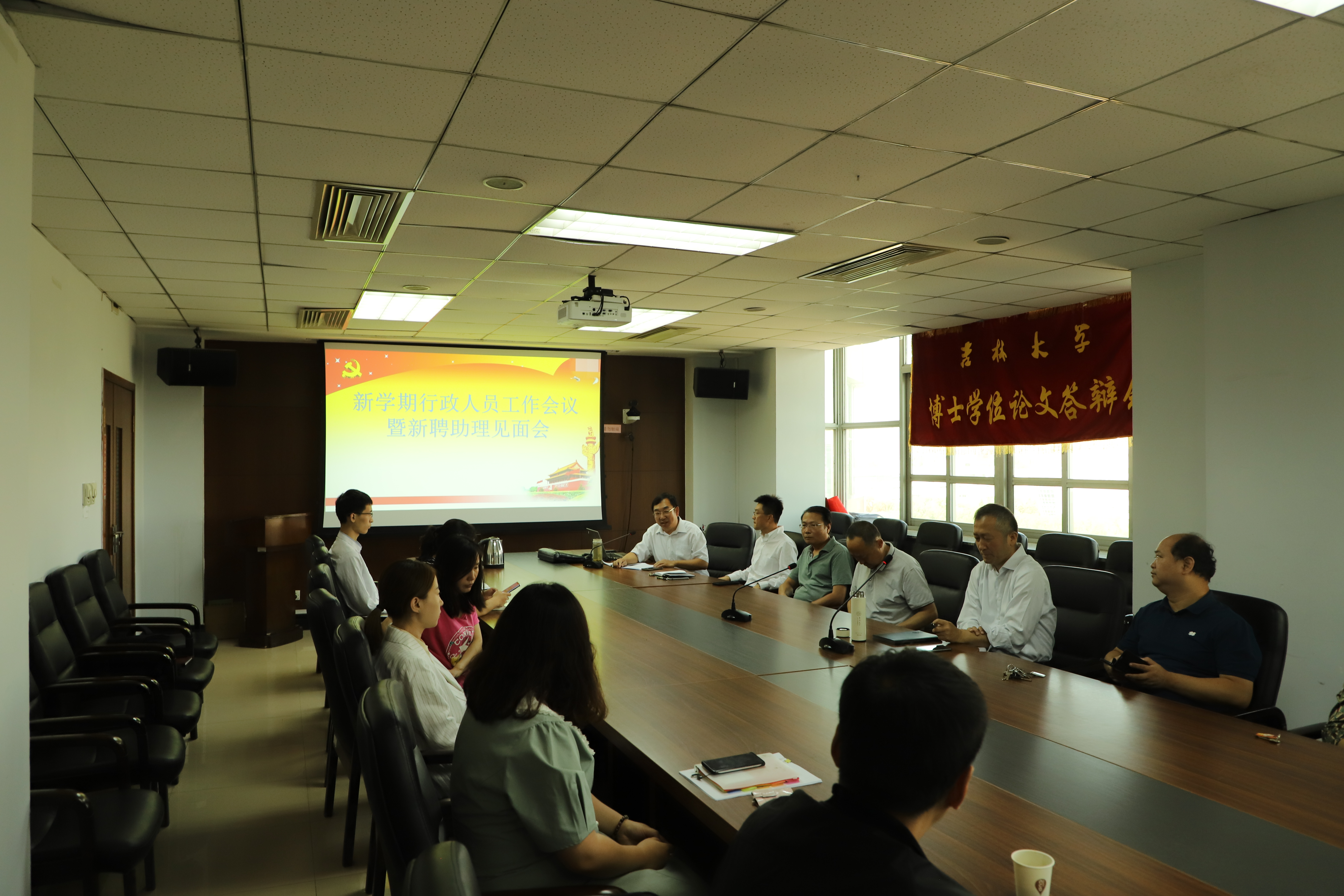新学期正式开学的第一天,中国·tyc1286太阳成集团(股份)有限公司召开新学期行政工作会暨新聘助理见面会,学院领导班子成员、全体行政人员和新聘短期助理参加了会议。会议由行政副院长朱文君主持。