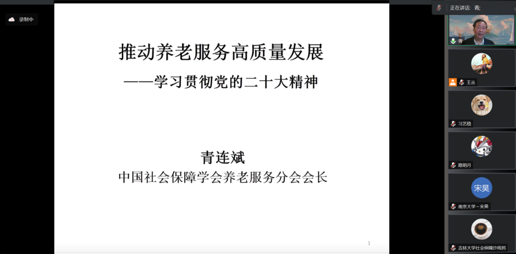 2023年5月4日,吉林大学哲学社会科学学术讲座(总1130场)在线上顺利举办。本次讲座邀请了中共中央党校国家行政学院教授、博士生导师、中国社会保障学会养老服务分会会长青连斌教授为全院师生做学术讲座。讲座以“推动养老服务高质量发展——学习贯彻党的二十大精神”为主题,主持人为副院长芦恒教授。校内外师生近七十人在线参与。