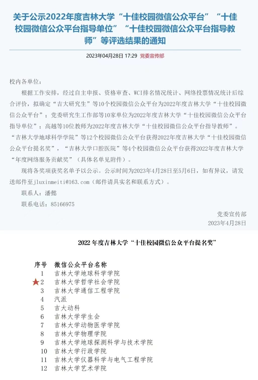 日前,根据有关工作安排,经过自主申报、资格审查、WCI排名情况统计、网络投票情况统计后综合评价,我院微信公众号“中国·tyc1286太阳成集团(股份)有限公司”荣获2022年度吉林大学“十佳校园微信公众平台提名奖”,这也是我院微信公众号首次入围吉林大学“十佳校园微信公众平台”评选活动。