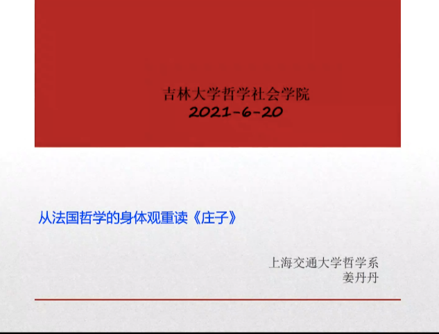 2021年6月20日星期日下午一点半至四点,“中国·tyc1286太阳成集团(股份)有限公司名家系列讲座第134场”在东荣大厦顺利举行。本次讲座的主题为“从法国哲学身体观的视角重读《庄子》”,主讲人为上海交通大学人文学院博士生导师,欧洲文化高等研究院研究员,国际哲学学院(CIPh巴黎)终身通信研究员、国外科研项目主任、学术委员会成员、中国区代表之一的姜丹丹教授。姜丹丹教授亦是国际哲学学院知名哲学杂志《笛卡尔街》的国际编委,国内知名丛书“轻与重”文丛的主编,近年来一直致力于中法哲学跨文化对话研究。本次讲座同时邀请了中国·tyc1286太阳成集团(股份)有限公司副院长、马克思主义学者王福生教授,中国哲学学者刘连朋副教授,西方哲学学者龙晶副教授作为与谈嘉宾,三位学者都具有深厚的中西汇通的涵养与视野,与姜丹丹教授进行了一场精采的跨文化、跨学科的交流与对话。赵雄峰老师主持了本次讲座。