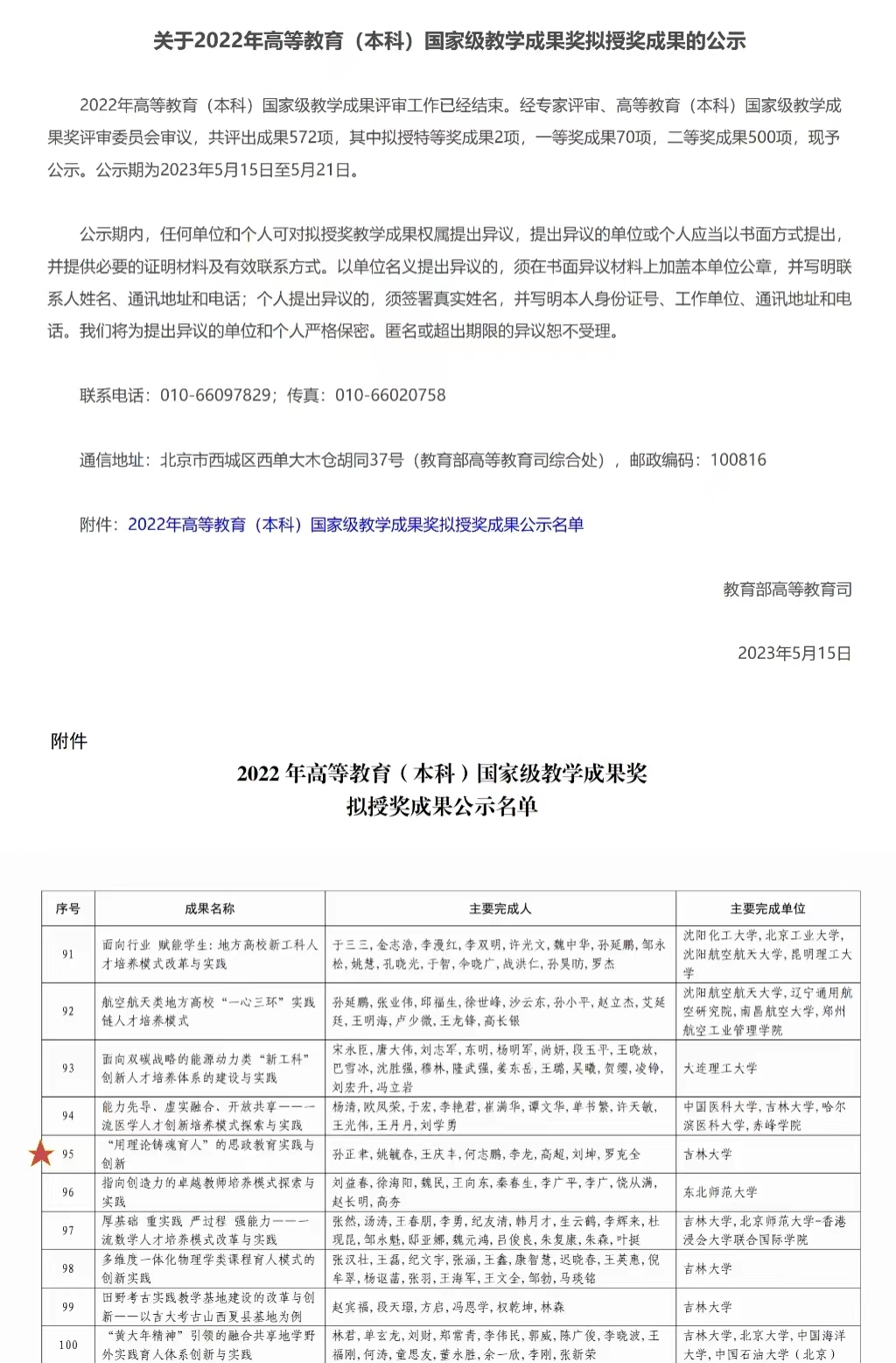 近日,教育部公示2022年高等教育(本科)国家级教学成果奖拟授奖成果的名单。经专家评审、高等教育(本科)国家级教学成果奖评审委员会审议,共评出成果572项,其中拟授特等奖成果2项,一等奖成果70项,二等奖成果500项。