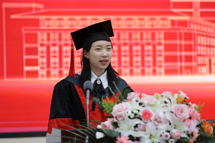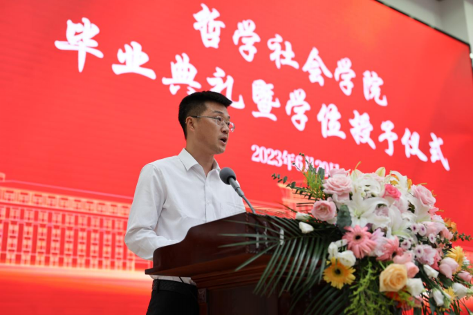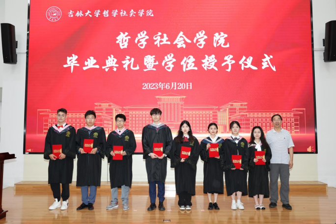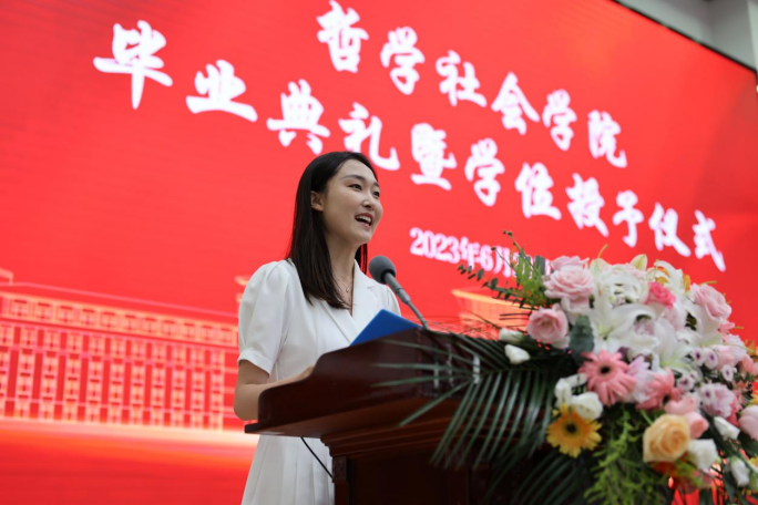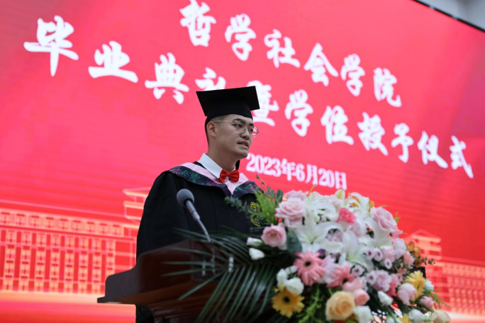 典礼第七项,学院毕业研究生代表,2023年度吉林大学十佳研究生、2020级马克思主义哲学专业博士研究生高天驹同学发言。高天驹同学将我院“为人治学,其道一也”的优良传统融入日常钻研奋斗,向在场的师生们讲到,吉大之大,大在一代代吉大人有“温度”,讲情怀,为学严谨,以德育人,凛然正气,洒脱通达;有“厚度”,敢担当,“哲思群理,修齐治平”的学院精神激励着一代又一代哲社人为“更多人的幸福”打开可能性的空间;有“深度”,重学识,在这一段宝贵又难忘的求学生涯中,每一个有限的“自我”都向着无限的知识不懈求索。
