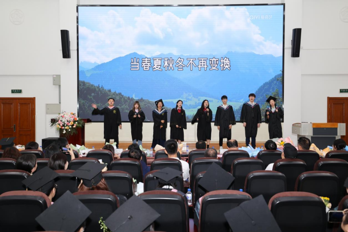 典礼最后,现场全体师生共同观看了由学院师生共同带来的精彩表演与毕业视频。四年一瞬,刹那芳华,而任流水东逝,带不走的是那些温情与感动。学院毕业生们为大家带来了精彩的歌唱表演,在轻快的节奏、悠扬的韵律之间,全场沉浸在一片洋溢着青春与活力的氛围之中。歌唱间隙,现场播放了由学院精心制作的毕业纪念短视频,一帧帧、一幕幕,涌入脑海、涌上心头;视频中,学院老师们给予了全体毕业生最真诚的祝福与最美好的祝愿。在回忆中,同学们终将奔向远方;在留恋中,同学们终将驶向未来。过往为序,青春为马。曾翻涌于盛夏,终各自灿烂于晴空。