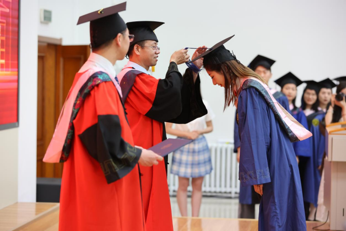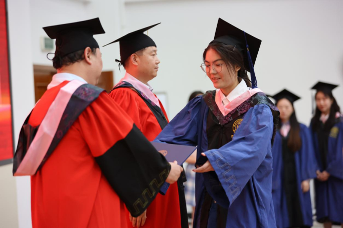 典礼第三项,学院党委副书记赵洁、副院长曲红梅为研究生优秀毕业生颁发证书,学院副院长朱文君为本科生优秀毕业生颁发证书。主席台上,学院老师们与同学们握手合照,手与手之间的相握,象征着哲社优秀学术传统与思想精神的代际传承,一如学院创建之初,一代又一代大师肩负起建设学院学术事业的重任,不断铸就学院学术上的新开创、新辉煌。而今学院毕业的学子们,接过这一伟大传承,必将笃行不怠、砥砺前行!