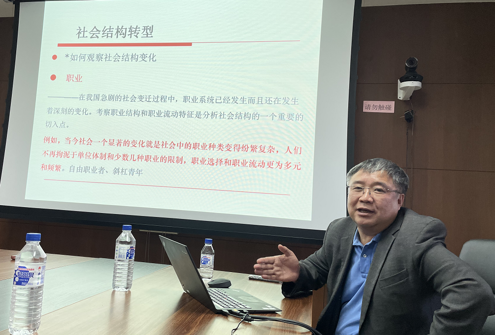 张教授首先指出,本次讲座的题目包含两层意涵。一是新社会阶层研究本身也是社会结构研究的一部分。二是新社会阶层研究对处于转型过程中的中国社会而言具有重大意义。结合多年研究思考和研究成果,张海东教授围绕着社会结构转型及其基本判断、新社会阶层及其群体特征和新社会阶层研究中的重要问题这三个方面进行详细阐述。他强调社会结构优化是保持社会稳定的重要原因之一,而社会结构研究是社会学研究的核心领域。对研究者而言,“如何观察社会结构的变化?”是开展研究之初首要回答的问题。张教授认为,在我国急剧社会变迁过程中,职业系统已经发生,并且还在持续发生着深刻的变化,当今社会职业种类纷繁复杂,人们不再拘泥于单位制和少数几种职业的限制,职业选择和职业流动更加多元、更为频繁,意味着考察职业结构和职业流动特征是分析中国社会结构的一个重要切入点。基于数据分析,张海东教授肯定了当下中国社会结构特征正朝向橄榄型社会迈进的趋势,认为在特大城市中橄榄型社会发展已然初具雏形,而导致这一社会结构形态产生的重要原因则在于新社会阶层的崛起和壮大。