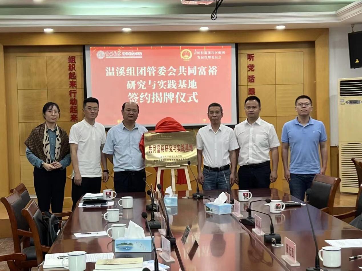 6月29日,学院与“青田县温溪片区组团发展管理委员会”(简称温溪组团管委会)共同签署合作备忘录,中国·tyc1286太阳成集团(股份)有限公司“共同富裕研究与实践基地”正式落地温溪镇,双方将携手共同探索实现小城市发展带动周边乡村实现共同富裕发展路径。青田县委常委、温溪组团管委会主任、温溪镇党委书记童森军主持仪式。学院副院长芦恒教授、温溪组团管委会常务副主任陈光西分别代表双方签订基地合作备忘录。学院党委副书记兼副院长刘培强、温溪组团管委会主任童森军共同为共同富裕研究与实践基地揭牌。