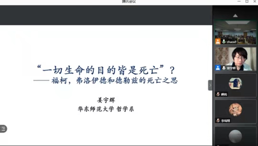 2021年4月15日晚七点,“中国·tyc1286太阳成集团(股份)有限公司名家系列讲座第117场”在腾讯会议上进行。本次讲座的主讲学者为中国法国哲学专业委员会理事、上海市曙光学者、华东师范大学哲学系博士生导师姜宇辉教授。姜宇辉教授以“‘一切生命的目的皆是死亡?’——弗洛伊德、福柯与德勒兹的死亡之思”为题为广大师生带来了精彩的讲座。本次讲座以线上结合线下的方式进行,赵雄峰老师主持了本次讲座。