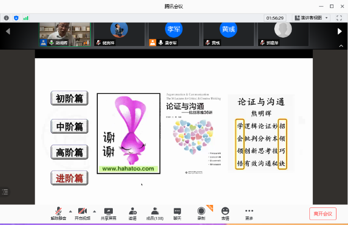 熊明辉教授接着重点讲述了思维如何批创。由浅入深地,用目不衔接的、充满趣味的精彩案例,从初阶篇、中阶篇、高阶篇和进阶篇这四个部分来一步步引导大家的批创思维的能力,并分享了很多论证与沟通的技巧。例如:我们应消除表述的语病,使相关的条件成立,穷尽涉及的选言,摆脱面临的困境,预见可能的后果,使数据与事实相合,避免出现认知性偏差,清晰思考,明晰写作,有效演讲,高效沟通,使用横向思维法和富兰克林法,遵守论证的通则等。