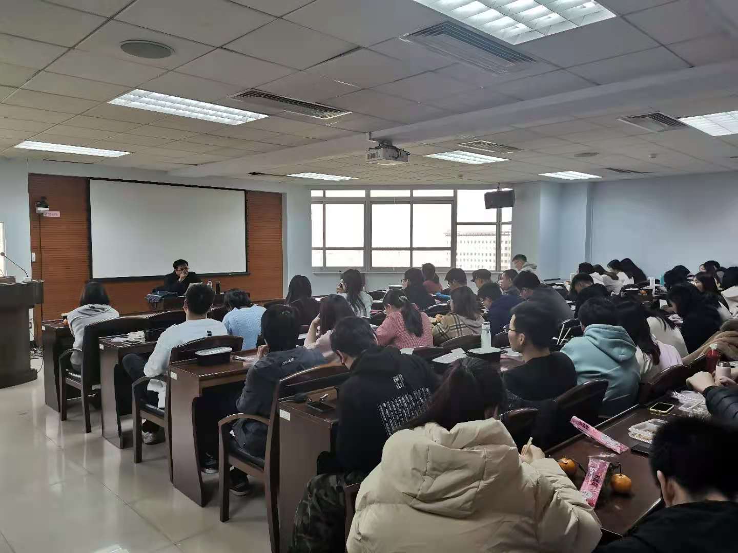 最后李海峰教授还和在场师生展开了互动讨论。李老师精彩幽默的讲话风格,使得现场气氛十分热烈。李海峰教授丰富的知识储备和多年的哲学工作经验,让同学们受益匪浅,也让大家十分期待下一次“学术月坛”活动。(张帆报导)