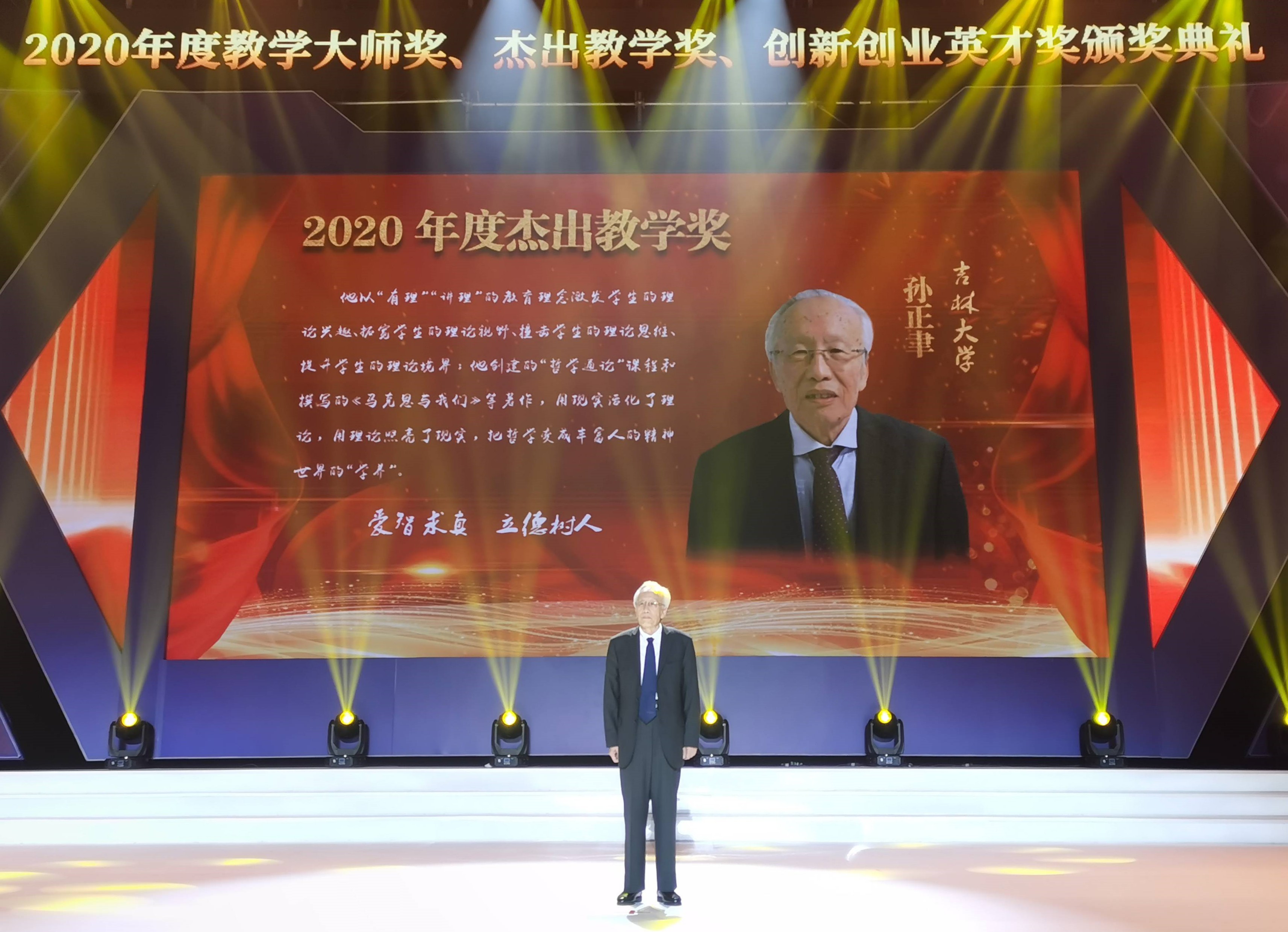 11月20日,第二届教学大师奖、杰出教学奖和创新创业英才奖颁奖典礼在华南理工大学举行。教育部原副部长林蕙青,高等教育司司长吴岩等出席颁奖典礼。著名哲学家、吉林大学哲学社会科学资深教授孙正聿获杰出教学奖,我校党委副书记、副校长王利锋出席颁奖典礼。