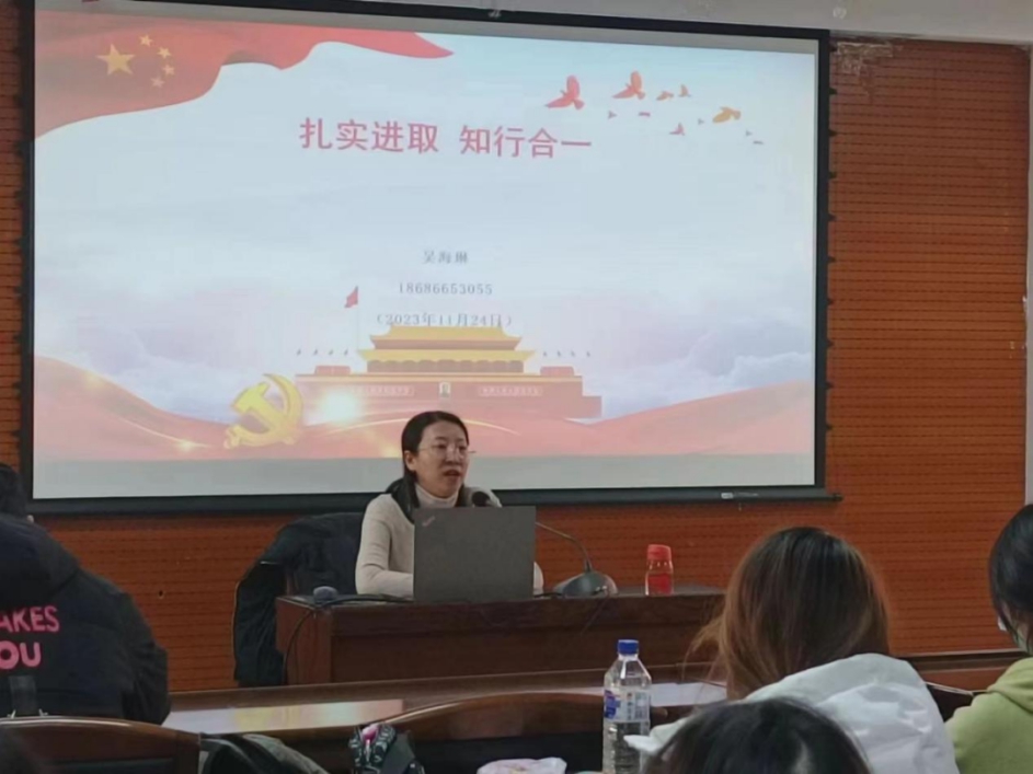随后,吴海琳教授深入讲述了青年奋斗与时代的关系。习近平总书记指出:“青年理想远大,信念坚定,是一个国家,一个民族无坚不摧的精神动力。”吴海琳教授勉励同学们,“奋斗是青春最亮丽的底色”,同学们正处于最好的年华,体力、智力、活力兼具,有着无限奋斗成才的可能。吴海琳教授指出,学院良好的治学氛围和广阔的资源平台为同学门提供了实现梦想的跑道,希望同学们要砥砺前行、不负期待。