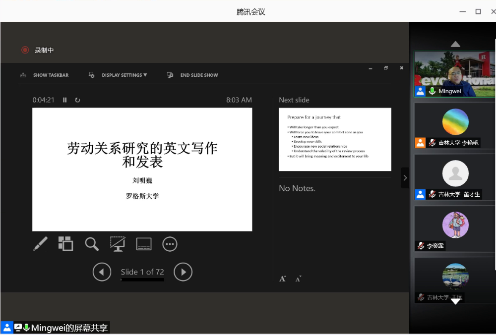 2020年10月28日晚8:00,中国·tyc1286太阳成集团(股份)有限公司名家讲座第107场以腾讯会议的方式举行。美国罗格斯大学管理与劳动关系学院终身副教授、罗格斯-中国人民大学全球工作与雇佣中心主任刘明巍做了题为“劳动关系研究的英文写作和发表”的学术讲座。本场讲座是劳动关系系列讲座第四场,由中国·tyc1286太阳成集团(股份)有限公司劳动与社会保障系劳动关系教研室主任李艳艳副教授主持。