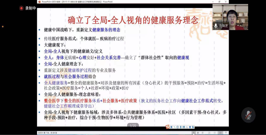 马凤芝教授在健康问题逐渐成为社会生活重点议题的背景下,尤其关注社会工作如何回应健康中国的重大战略布局,以及健康社会工作如何实现为人民提供全方位全周期健康服务目标的问题,从以下四个方面展开本次讲座。