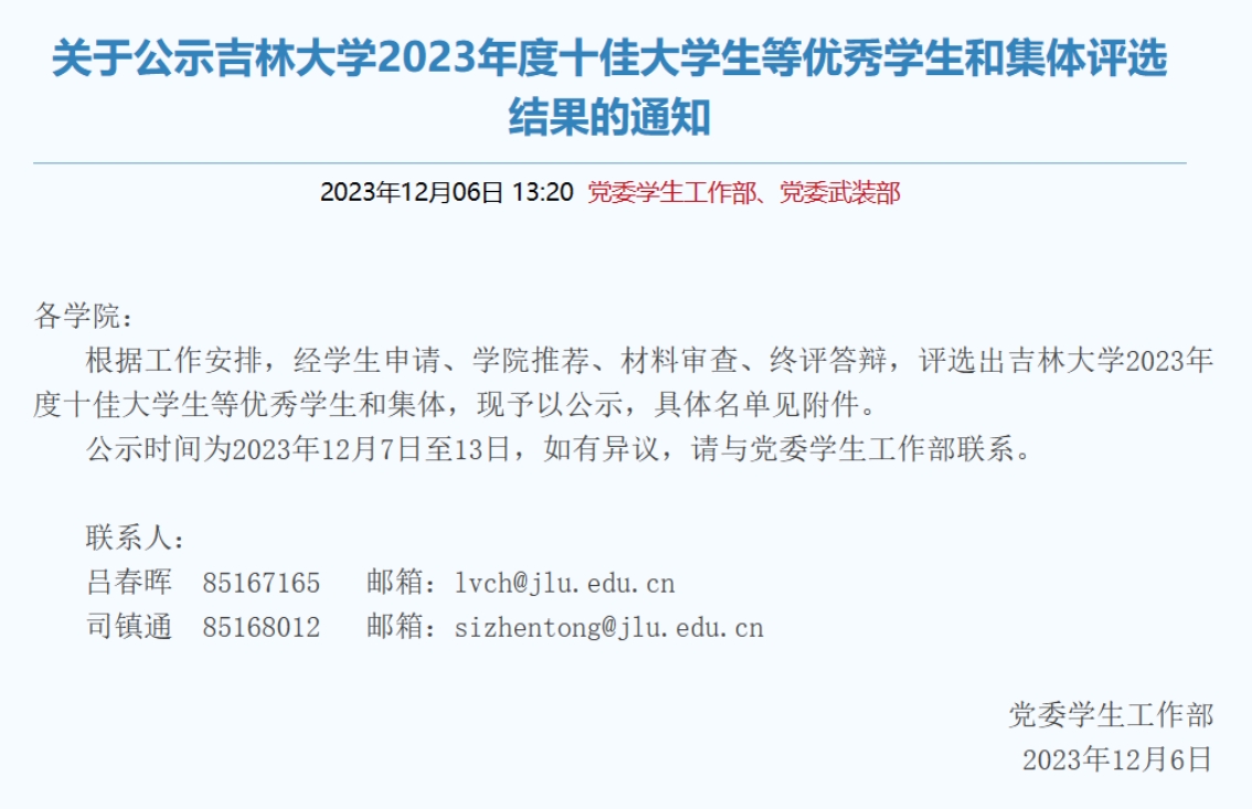 同时,2020级哲学1班荣获吉林大学2023年度十佳班级入围奖;2020级社会学专业本科生魏向南同学荣获吉林大学2023年度自强自立大学生入围奖。