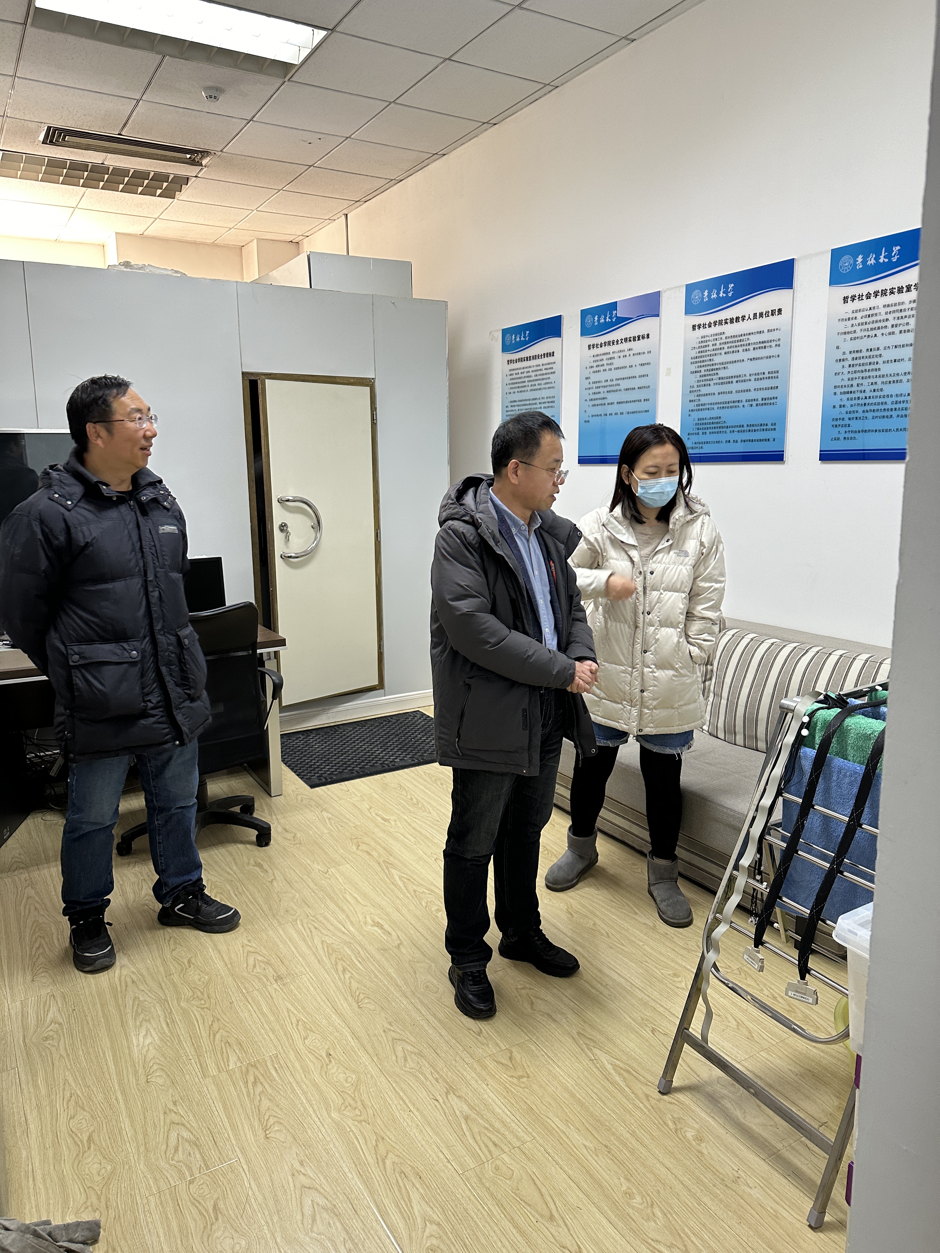 按照学校春季学期安全生产工作要求,为更好地落实我院安全生产工作,2024年2月29日下午,在白刚院长带领下,学院行政副院长朱文君、心理学实验教学中心主任张彦彦、社会学实验教学中心主任张仕平、行政办公室主任于海天、实验员张倩一行六人,对我院心理学实验教学中心、社会学实验教学中心、资料室、教师科研办公室进行安全生产工作检查。
