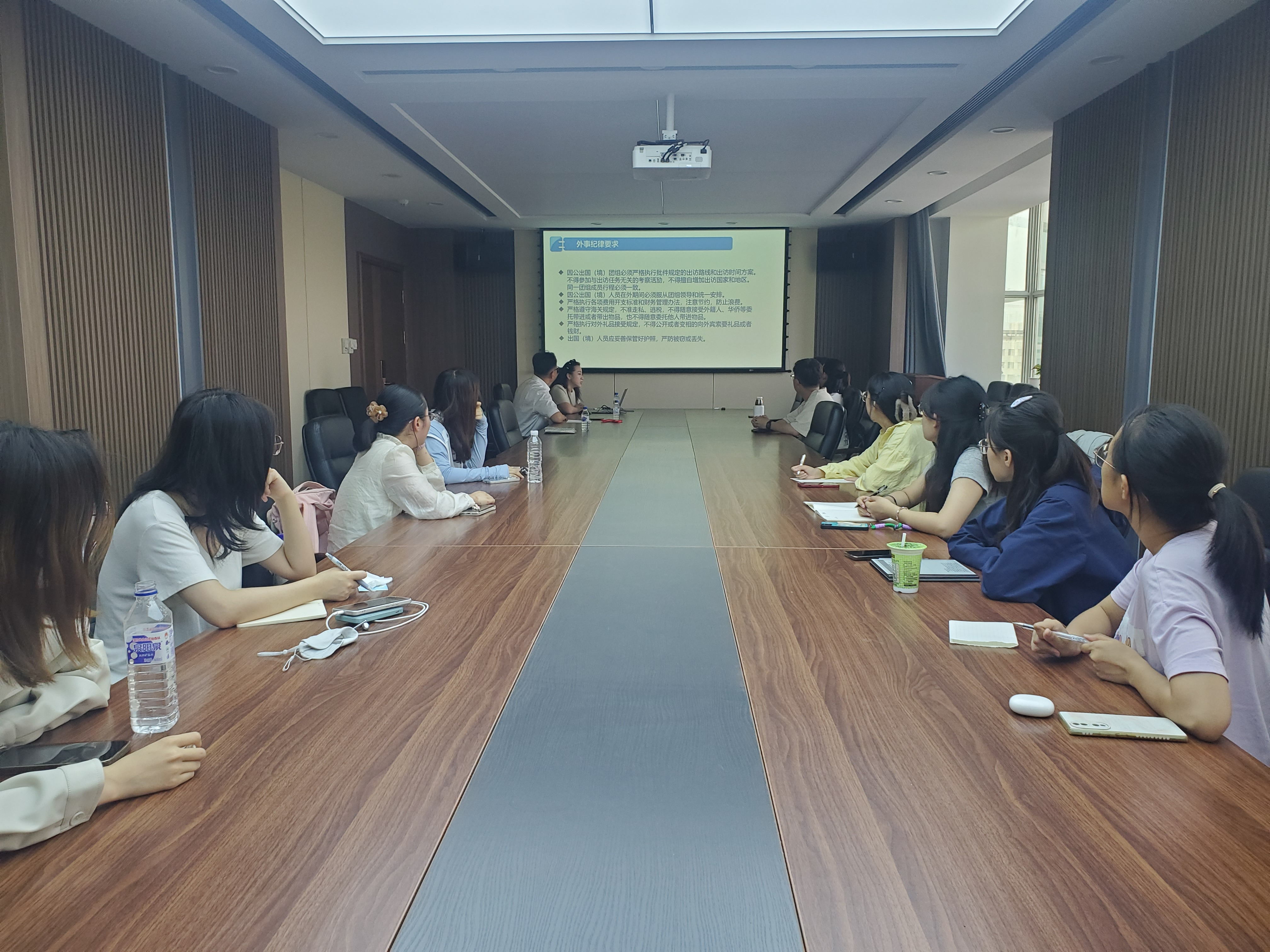 刘爽科长从国家安全与保密纪律、外事纪律要求、出访团组管理、国(境)外突发事件应急处理与领事保护等方面进行了细致地讲解,她还向团组成员详细介绍了目的国家、目的院校的基本情况和西方礼仪,并提醒团组成员做好行前准备。
