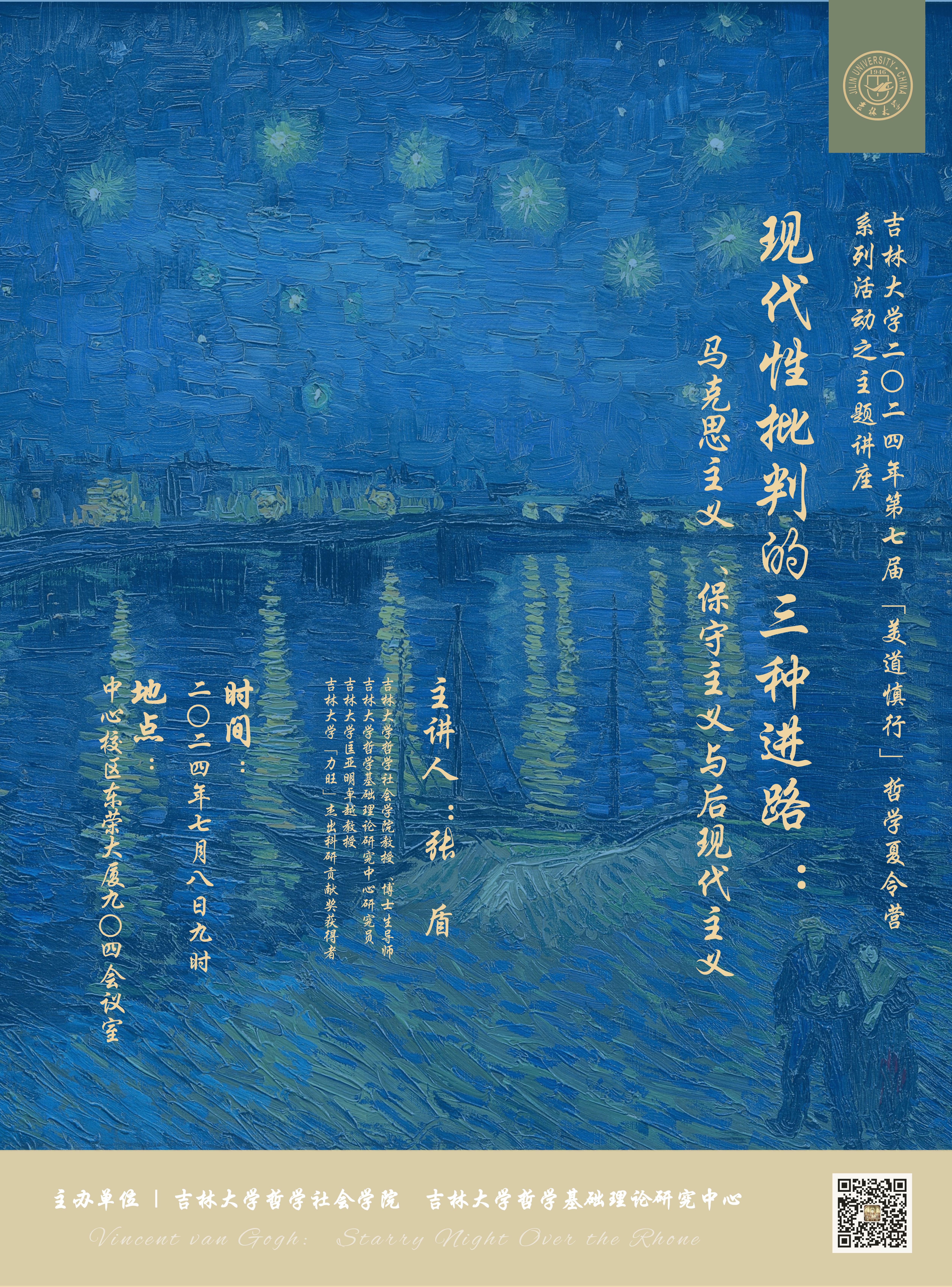 7月8日上午9时,在吉林大学中心校区的东荣大厦904会议室,吉林大学哲学基础理论研究中心专职研究员、吉林大学匡亚明卓越教授、吉林大学“力旺”杰出科研贡献奖获得者张盾教授为参加吉林大学2024年第七届“美道慎行”哲学夏令营的营员们做了题为“现代性批判的三种进路:马克思主义、保守主义与后现代主义”的主题讲座。张盾教授指出,保守主义在一般庸常之见赞美的现代性的进步表象背后,看到了人类在精神领域的某种更深刻的失落与危机,是对马克思现代性批判理论的一种重要补充;后现代主义是人类精神发展的一个重要的自我否定阶段,对马克思批判现代性资本主义构成了重要的呼应,但人类的精神发展和生活本身不能仅仅停留在否定阶段,而是永远需要在建构与前进中实现自身;马克思主义哲学作为当代最深刻的现代性批判理论,是继德国古典哲学之后最有根基、最具解释力、因而真正具有文化领导权意义的一种哲学,是人类走向解放道路的一个不朽的思想路标。