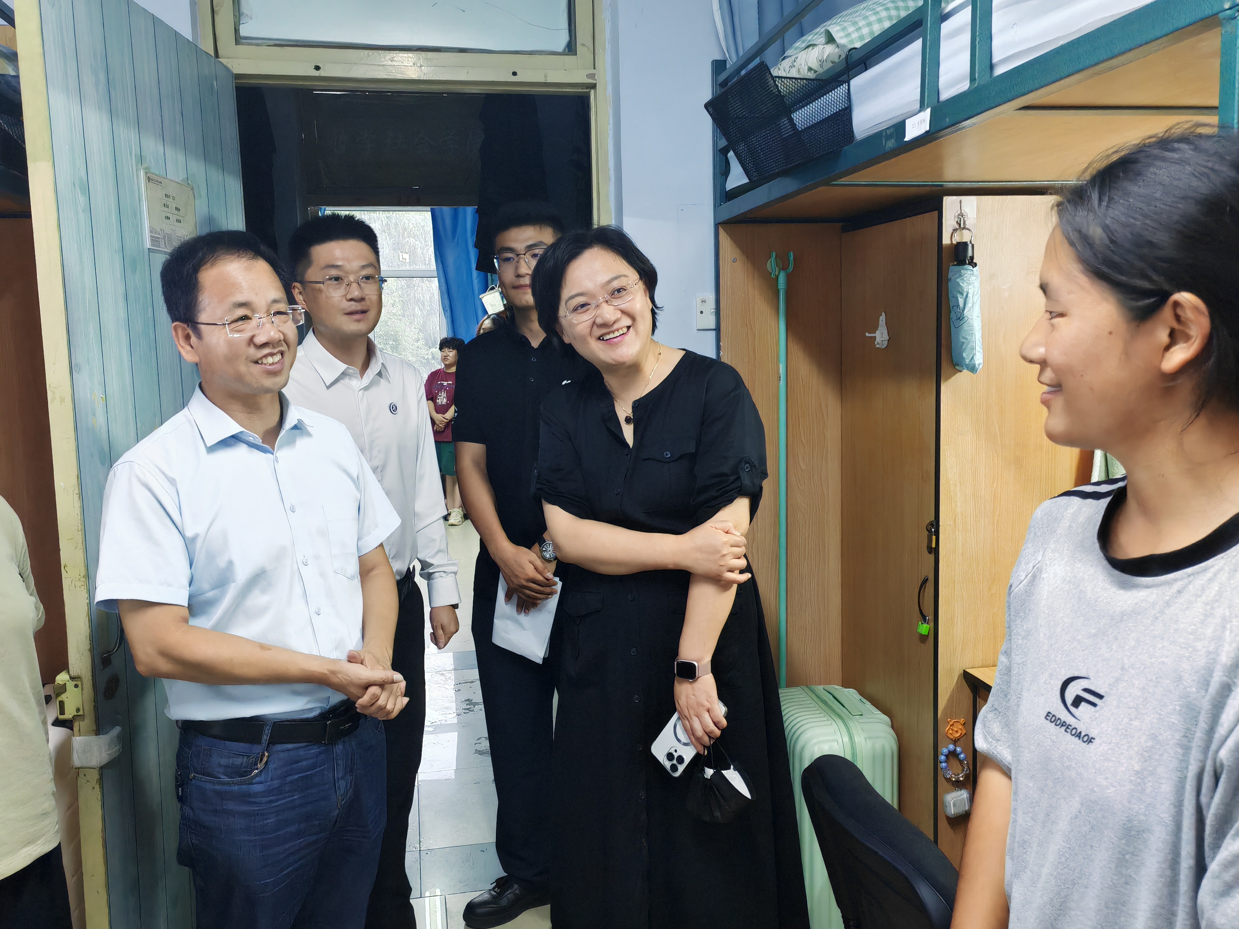 为深入了解2024级本科新生情况,帮助同学们尽快适应大学的学习生活,传递学院的关心关怀,8月26日晚,院长白刚、党委书记张晓萌,党委副书记兼副院长刘培强以及学院学生工作办公室全体老师和辅导员助理同学们共同来到本科新生宿舍,走访看望新生。