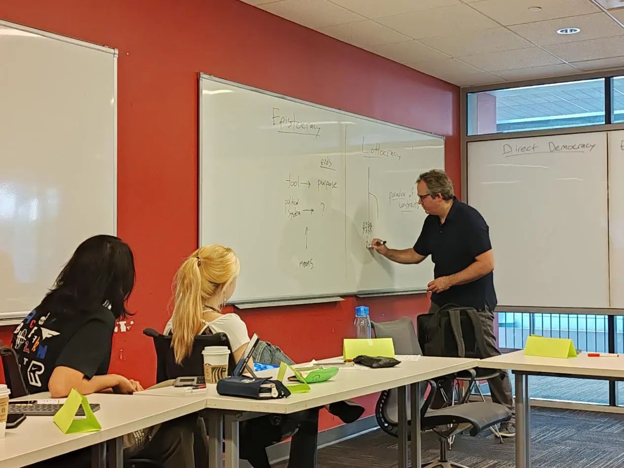 本次暑期学校的第一堂课是Alex Guerrero教授的当代政治哲学讲座。Guerrero教授首先从工具性、正义性、公平性等方面,介绍了对政治系统的不同评价标准,接着,教授对直接民主、选举代表民主、宪政民主等几种基本民主政治形式进行了讲解。其中,精英选举制度的可行性与公平度问题引起了师生们的热烈讨论,同时,哲学史上经典的“电车难题”以及由此引申出的政治目的与手段的正当性问题也受到了师生们的关注。Guerrero教授在讲座中引入自己的最新研究主题——Lottocracy(抽签民主),打开了同学们的视野,这种民主形式不仅具有公平性上的优势,在当代政治中也不乏操作的可能性。