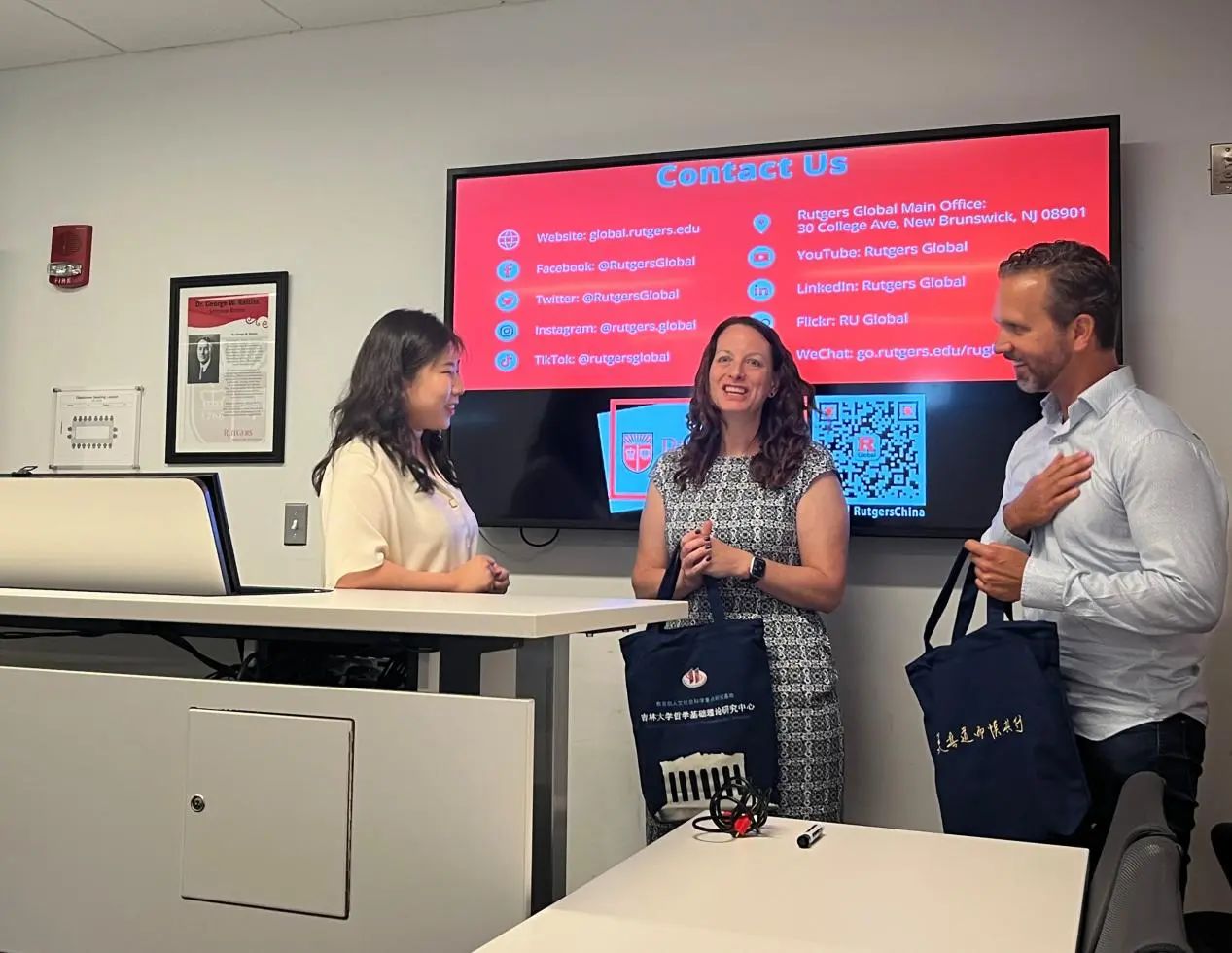 张心耀老师代表我院师生向罗格斯大学的校领导和老师们赠送吉林大学文创纪念品,感谢罗格斯大学对我院师生的热情款待。