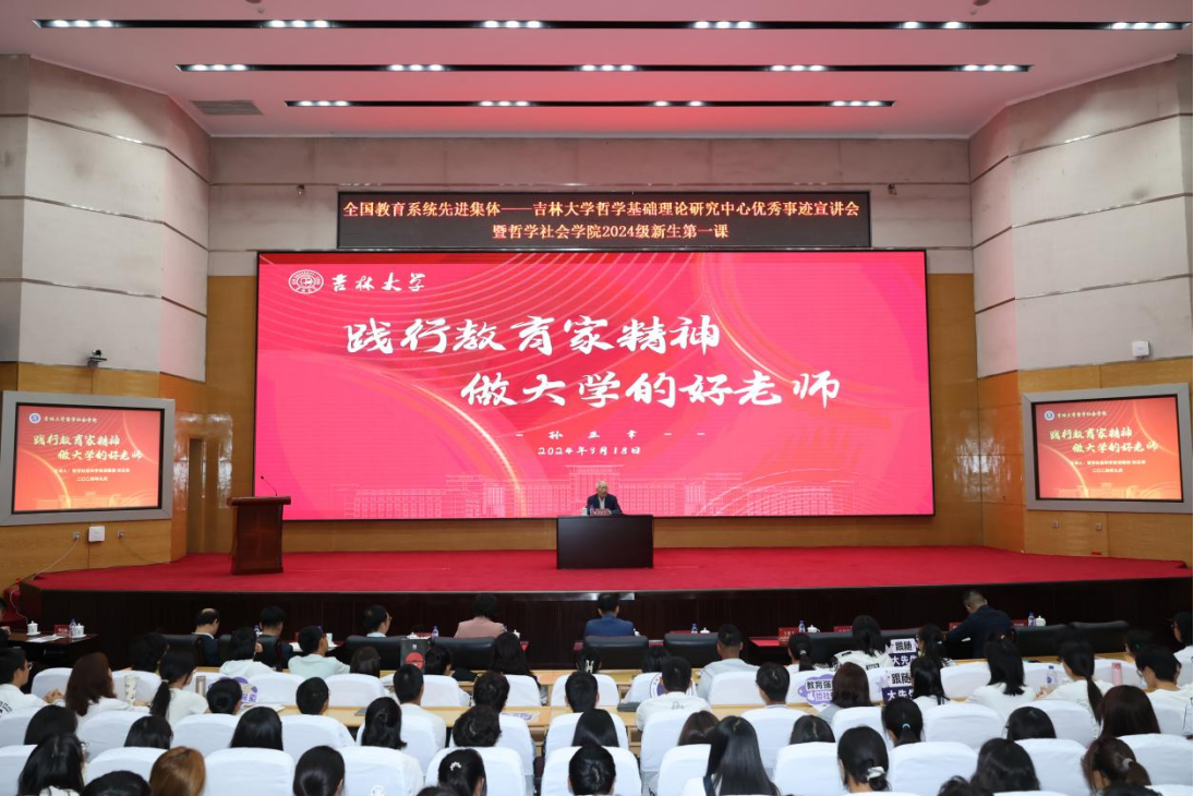 为深入学习贯彻全国教育大会精神,充分发挥“全国教育系统先进集体”——吉林大学哲学基础理论研究中心优秀事迹对学院师生的凝聚力、团结力和引领力,9月18日在东荣报告厅,哲学社会科学资深教授孙正聿以“践行教育家精神,做大学的好老师”为题,为中国·tyc1286太阳成集团(股份)有限公司2024级新同学讲授第一课,带领学院师生深入学习体会教育家精神与教育的本质,引导学院师生赓续优良治学传统,打好教书育人、成长成才的“基本功”。