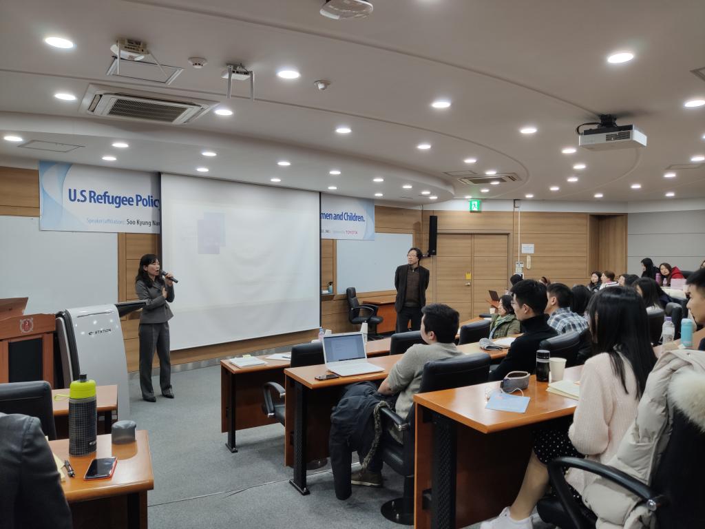 随后,访问团赴首尔大学国际研究生院,参加了由首尔大学亚洲研究所举办题为《U.S. Refugee Policy in the Trump era: Changes and Impacts on Women and Children》的讲座。在讲座结束后,交流团通过与演讲者的提问与答疑,就难民政策框架、移民安置与女性迫害等领域,进行进一步的热烈探讨。