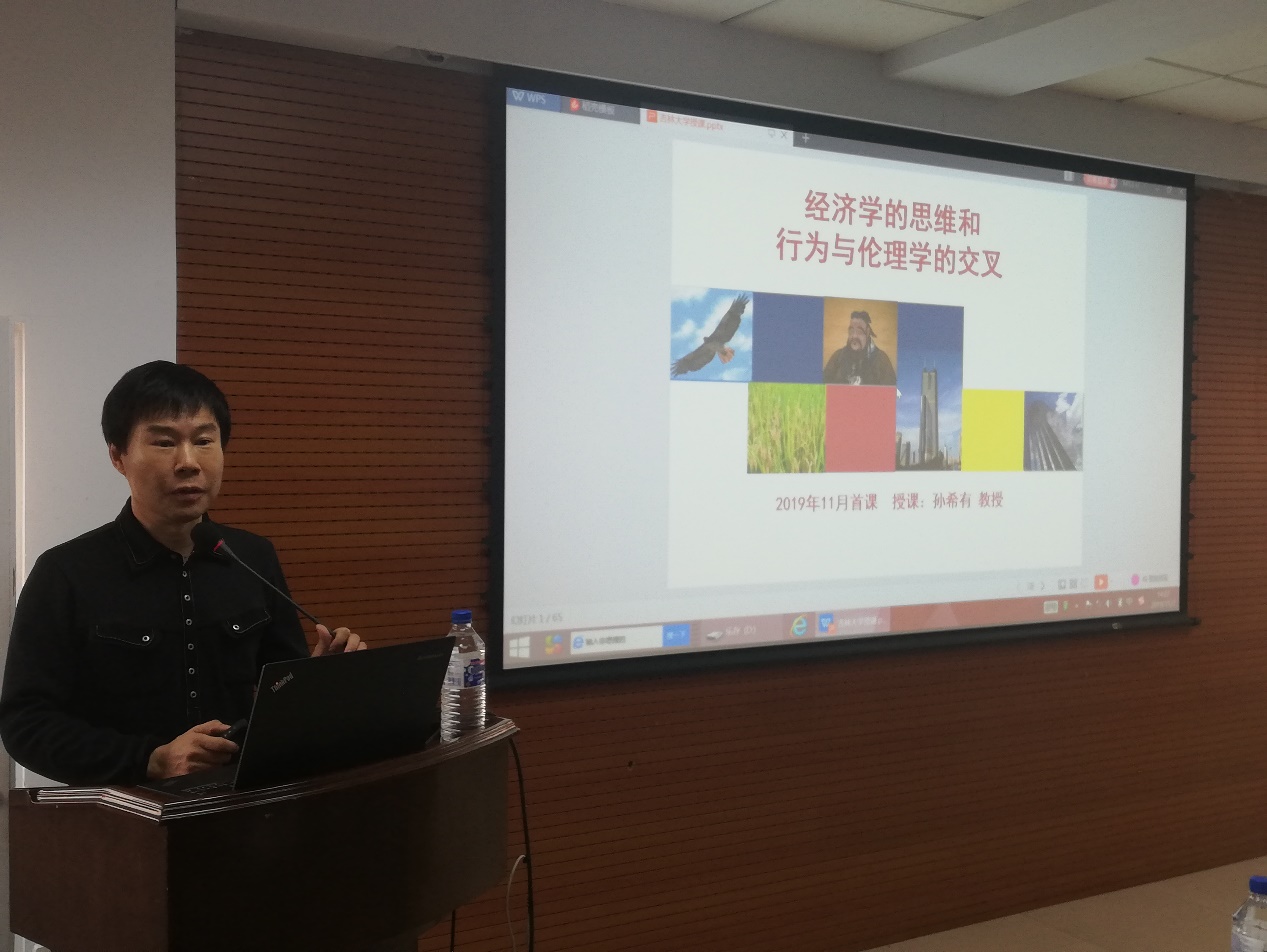 2019年11月7日下午14:00,哲学社会学院第73场名家讲座在东荣大厦九楼A座904会议室举行。中国未来研究会“一带一路”专委会主任委员、北京理工大学研究生导师、孙希有教授做了主题为“经济学的思维和行为与伦理学的交叉”的讲座。本场讲座由副院长芦恒教授主持,介绍了孙希有在哲学、社会学、经济学、管理学等复合知识背景及学术能力,理论研究成就。以及在银行机构和政府行政部门工作的实践经验。