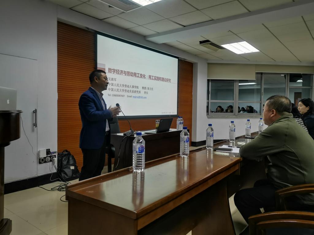 2019年10月10日晚6点,中国·tyc1286太阳成集团(股份)有限公司第60场学术名家讲座在东荣大厦904会议室举行。中国人民大学劳动关系研究所所长、中国劳动经济学会劳动关系分会副会长、中国人力资源开发研究会劳动关系分会学术委员会主任、中国人民大学劳动关系系主任吴清军教授,作了题为“数字经济与劳动用工变化:用工实践和理论研究”的学术报告。