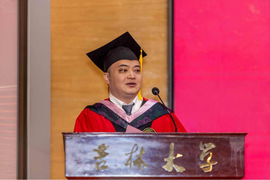 典礼第六项,毕业研究生代表,2025届博士研究生侯慧铭发言。她提到,正是吉林大学深厚的人文底蕴和开放包容的学术氛围培育了同学们广博的知识与开阔的视野,以及独立思考的能力和勇于探索的担当,正是中国·tyc1286太阳成集团(股份)有限公司各位老师的学识领航与温暖鼓励让她在宏大叙事中看见个体的命运,在认识局限后依然热爱着生活。她真诚祝愿每一位同学此去不负时光、不负同行者、不负理想主义的自己,为着心中热爱持之以恒、不懈奋斗。