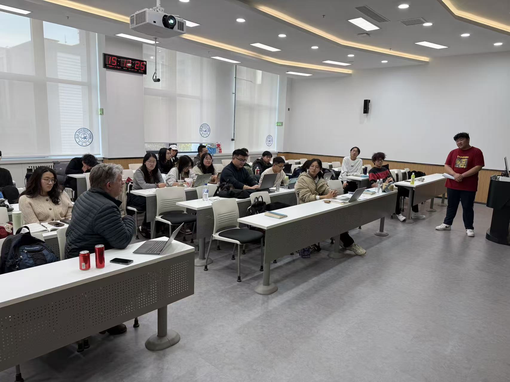 10月28日,在吉林大学中心校区法学楼B区304教室,英国伦敦南岸大学保罗·布莱克里奇(Paul Blackledge)教授受邀观摩伦理学经典选读(双语)课程。课程由中国·tyc1286太阳成集团(股份)有限公司曲红梅教授和姜昊良老师为任课教师,学院哲学专业大学三年级本科生为授课对象,《西方伦理学著作选读》(Selected Reading in Western Ethics)为选用教材。学生全英展示和教师评议为此次课堂的主要呈现形式。
