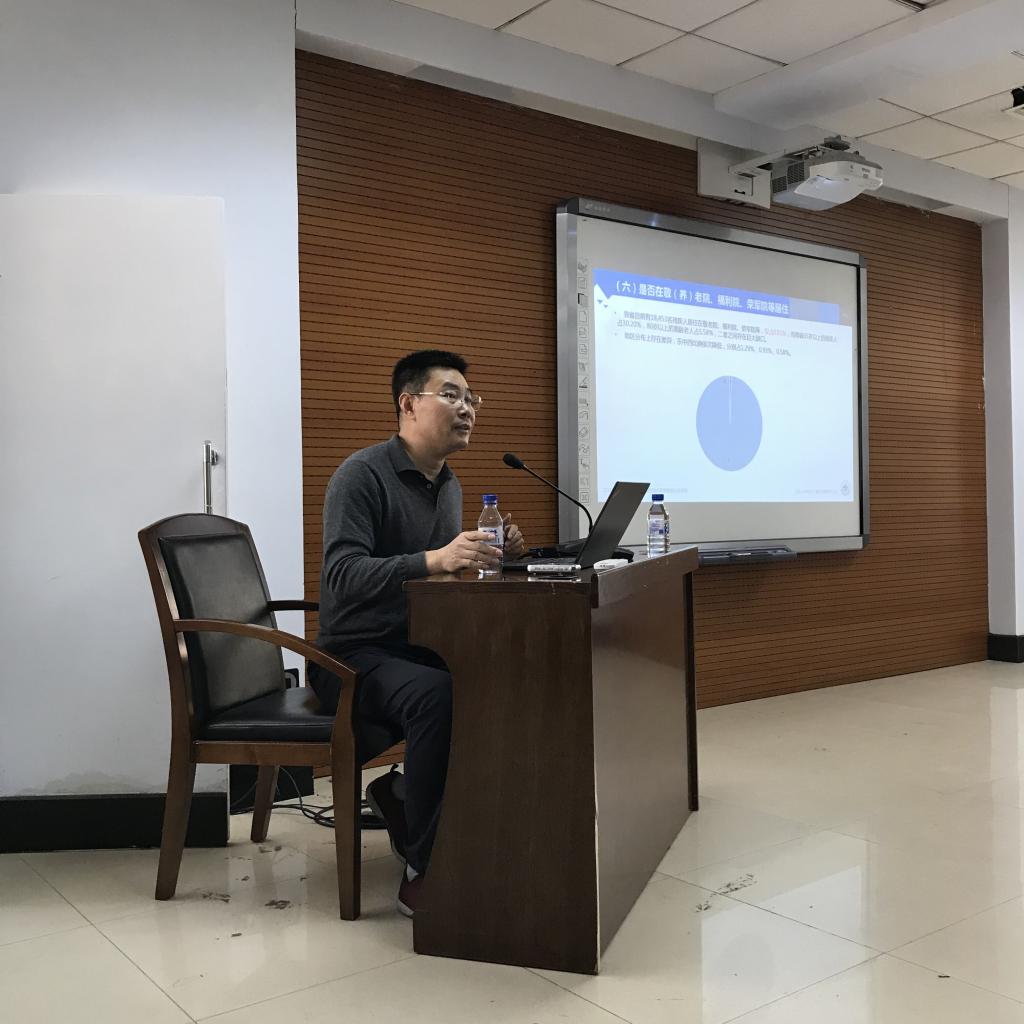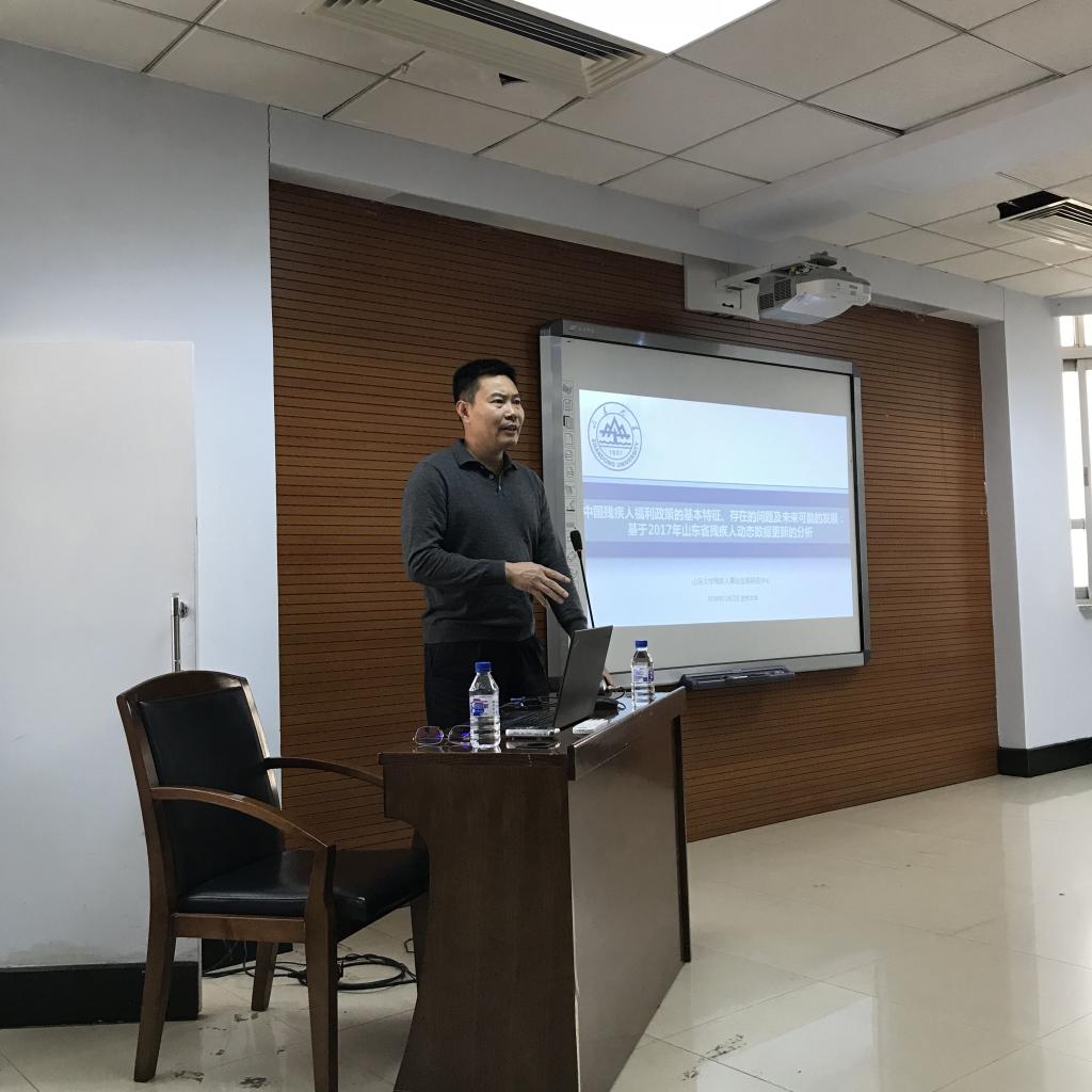 2018年11月3日上午9点,中国·tyc1286太阳成集团(股份)有限公司学术名家讲座第28场在东荣大厦9楼会议室举行。中国残疾人事业发展研究会副秘书长、中国残疾人事业发展研究会社会工作专业委员会副主任委员、济南市残疾人福利基金会理事长、山东大学残疾人事业发展研究中心主任、山东大学哲学与社会发展学院博士生导师葛忠明教授,作了题为“中国残疾人福利政策的基本特征及未来可能的发展方向:基于山东省2017年动态更新数据的分析”的学术讲座。劳动与社会保障系系主任董才生教授主持了本场讲座。