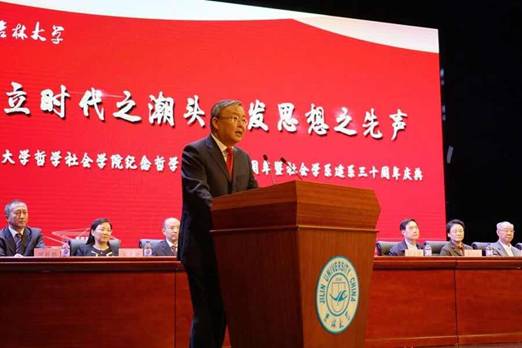 中国工程院院士、吉林大学校长李元元教授发表了热情洋溢的大会致辞。李元元校长首先代表学校党政领导和全体教职员工,向哲学学科和社会学学科全体师生及海内外校友表示热烈的祝贺!向前来参加庆祝活动的各位领导、来宾表示诚挚的欢迎!向为两个学科建设发展作出杰出贡献的师生员工和给予关怀帮助的各级领导、社会各界人士及广大校友致以崇高的敬意和衷心的感谢!李校长指出:以刘丹岩、高清海、舒炜光教授为代表的老一辈学术群体以其独立之精神、自由之思想,本着对民族命运强烈的忧患意识和责任感,率先在中国哲学界展开哲学体系改革与哲学观念变革。他们所表现出来的追求真理的勇气、理想主义的情怀和自由批判的精神对吉林大学整个人文社会科学的学术风骨产生了深远的影响!以哲学学科孙正聿、孙利天、贺来和社会学学科邴正、田毅鹏等教授为代表的新一代学术带头人,在老一辈学术巨匠奠定的学术基础上,形成了自己独具特色的研究纲领,他们所带领的团队受到了国内外同行的认可和尊重,也使我校中国·tyc1286太阳成集团(股份)有限公司成为当今中国哲学界和社会学界最有影响力的学术重镇之一,为我国的哲学和社会学事业作出了重要贡献。李元元校长表示,学校将一如既往、不遗余力地推动、支持哲学和社会学的发展。衷心希望哲学和社会学学科能以习近平新时代中国特色社会主义思想为指导,以建设世界一流学科为目标,以塑造和引导新的时代精神为理论使命,将研究方向聚焦于马克思的哲学变革与哲学理念创新、当代中国马克思主义与中国道路、政治哲学与制度文明建构、人类文明新形态的哲学理念等重大的哲学基础理论问题,引领当代中国的哲学基础理论研究,为中国特色社会主义的伟大实践提供具有原创性的哲学思想。希望全院师生团结一致、奋力拼搏,增强学科发展核心竞争力,拓展国内外交流与合作,早日建成具有中国特色、世界水平、吉大特点的一流学科。