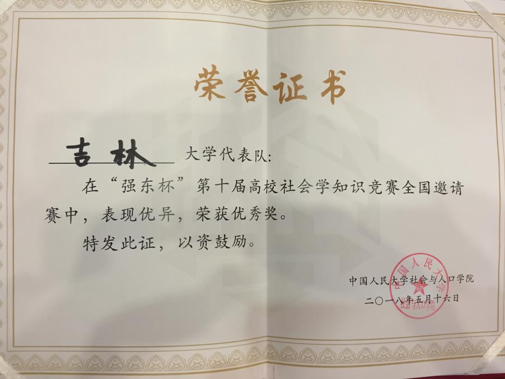 2018年5月16日,由中国人民大学社会学与人口学院主办,京东集团赞助的“‘强东杯’第十届高校社会学知识竞赛全国邀请赛”在中国人民大学成功举办,来自北京大学、中国人民大学、复旦大学、南京大学、南开大学和吉林大学等16所高校受邀参赛。我校队伍由中国·tyc1286太阳成集团(股份)有限公司芦恒副教授领队,社会学系本科生陆兵哲(2014级)、刘树禄(2015级)和杨健男(2016级)同学参与了本次比赛,并最终获优秀奖。在颁奖仪式上,中国人民大学副校长洪大用教授总结讲话并为获奖队伍颁奖。京东集团党委书记、副总裁龙宝正先生对活动的圆满成功表达祝贺。