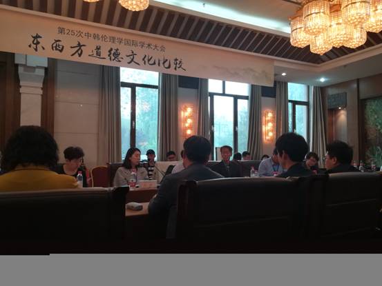 22日下午大会进入了分组讨论环节。梁镇玺同学因其提交的论文应邀参与了第四分会场“东西方道德文化比较”主题讨论,在讨论中韩两国学者就中韩两国宗教伦理问题,医学伦理问题等问题相互提问、相互启发、相互学习,气氛友好。