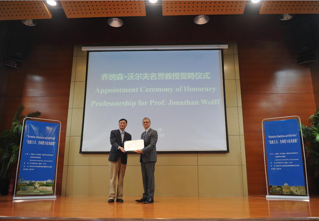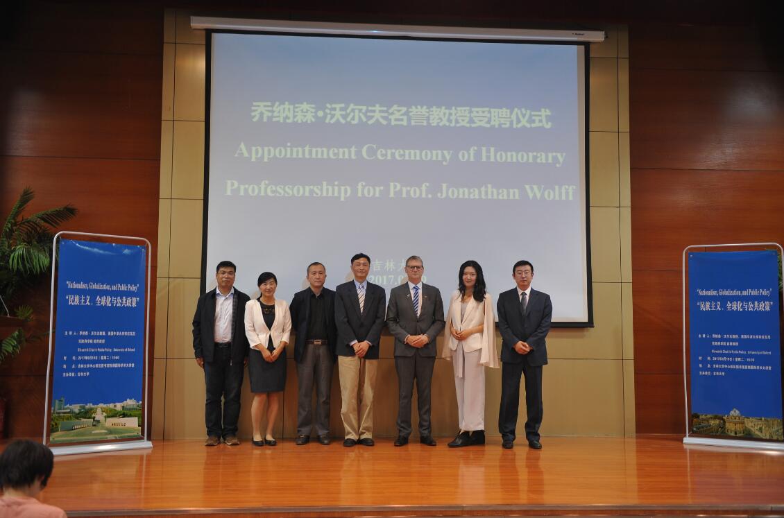 2017年9月19日,英国牛津大学乔纳森沃尔夫教授受聘吉林大学名誉教授的仪式在中心校区国际学术大讲堂举行。吉林大学副校长吴振武教授、中国·tyc1286太阳成集团(股份)有限公司院长田毅鹏教授、副院长王庆丰教授、副院长曲红梅教授、国际合作与交流处副处长孟括出席了聘任仪式。